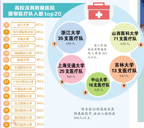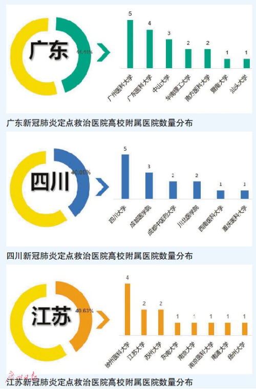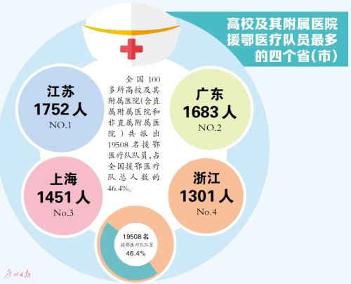 高校及其附屬醫院是我國醫療救治、醫學科研體系的重要組成部分。新冠肺炎疫情發生以來,高校及其附屬醫院在疫情防控、醫療救治中發揮了重要甚至關鍵性作用。昨日,廣州日報數據和數字化研究院(GDI智庫)發布《疫情防控中的高校力量》(以下簡稱《報告》),《報告》運用大數據技術,聚焦高校及其附屬醫院在援鄂醫療、本地定點救治、科研抗疫等方面的表現,展現高校醫療、科研力量在疫情防控人民戰爭、總體戰、阻擊戰中體現出的責任和擔當。 數據顯示,全國100多所高校及其附屬醫院(含直屬附屬醫院和非直屬附屬醫院)共派出19508名援鄂醫療隊隊員,占全國援鄂醫療隊總人數的46.4%。各地陸續確定新冠肺炎定點救治醫院中高校附屬醫院占比25.59%。 文、表/廣州日報全媒體記者徐靜 圖/新華社 《報告》主要分析對象為:設有醫學類學科、專業的“雙一流”建設高校,醫藥類高校,以及部分含醫藥類碩士點的高校(不含軍隊院校)。數據來源于國家衛健委和各地衛健委、高校及其附屬醫院和權威媒體。援鄂醫療數據統計截至3月9日,科研抗疫數據統計截至3月27日。 來自高校及其附屬醫院的抗疫一線專家 新冠肺炎疫情發生以來,諸多高校專家學者、醫生護士投身“戰場”,科學“抗疫”,發揮重要甚至關鍵性作用。 鐘南山院士 1月20日,廣州醫科大學附屬第一醫院鐘南山院士在央視新聞節目中首次公開新型冠狀病毒存在“人傳人”的現象,引起社會強烈關注。 李蘭娟院士 1月下旬,浙江大學醫學院附屬第一醫院李蘭娟院士提出武漢“封城”建議,這對有效控制新冠肺炎疫情在全國范圍蔓延具有里程碑意義。 王辰院士 2月5日,中國醫學科學院北京協和醫學院王辰院士接受“新聞1+1”連線采訪時對方艙醫院的使用進行了解釋和說明,并強調解決收治容量的問題。方艙醫院自投入使用以來,大量收治輕癥病人,是隔離控制傳染源、避免患者之間交叉感染的有效舉措。 喬杰院士 2月12日,北京大學第三醫院喬杰院士在醫學期刊《柳葉刀》發表評論文章,指出孕婦和新生兒應被視為關鍵的風險人群。 張伯禮院士 3月11日,天津中醫藥大學校長張伯禮院士表示,對于隔離確診患者、疑似患者、發熱患者、確診患者的密切接觸者,給予中藥湯劑,起到了分化人群、控制病情、撫慰情緒的作用。 高校及其附屬醫院派出援鄂醫療隊隊員近2萬人 新冠肺炎疫情發生以來,全國100多所高校及其附屬醫院(含直屬附屬醫院和非直屬附屬醫院)共派出19508名援鄂醫療隊隊員,占全國援鄂醫療隊總人數的46.4%。 江蘇高校及其附屬醫院派出1752人,數量居首;廣東高校及其附屬醫院派出1683人,位列第二;上海高校及其附屬醫院派出1451人,浙江高校及其附屬醫院派出1301人,分列三、四位。 GDI智庫對高校及其附屬醫院派出援鄂醫療隊人數進行數據挖掘分析,5所高校及其附屬醫院人數在500人以上。浙江大學35支醫療隊共658人,山西醫科大學71支醫療隊共625人,上海交通大學25支醫療隊共566人,吉林大學13支醫療隊共543人,中山大學16支醫療隊共525人。排名前20的高校及其附屬醫院中,派出人數均在300人以上。 廣東8所高校及其附屬醫院累計派出援鄂醫療隊1877人(含高校在省外開設的附屬醫院數據)。其中中山大學16支醫療隊伍共525人、廣州中醫藥大學48支醫療隊伍共382人、南方醫科大學14支醫療隊共286人,位列前三。 高校附屬醫院派出45支“百人天團” 多所高校附屬醫院一次性派出超百人的醫療隊馳援湖北,這樣的醫療隊被稱為“最美逆行者”中的“百人天團”。截至3月9日,23所高校及其附屬醫院先后派出45支“百人天團”醫療隊。 “北協和、南湘雅、東齊魯、西華西”以及中山醫等醫療團隊支援武漢。北京協和醫院和中南大學湘雅醫院分別“整建制”獨立接管武漢同濟醫院中法新城院區ICU、武漢協和醫院西院區重癥病房;山東大學齊魯醫院、四川大學華西醫院共同接管武漢大學人民醫院東院區。1月27日、2月13日,南昌大學第二附屬醫院先后派出138名和137名醫療人員支援湖北,是唯一一所派出兩批“百人天團”的高校附屬醫院。 高校及其附屬醫院醫務人員表現突出 3月5日,國家衛生健康委、人力資源和社會保障部、國家中醫藥管理局印發《關于表彰全國衛生健康系統新冠肺炎疫情防控工作先進集體和先進個人的決定》,授予472位同志“全國新冠肺炎疫情防控工作先進個人”稱號,追授34位同志“全國衛生健康系統新冠肺炎疫情防控工作先進個人”稱號。北京、江蘇和廣東高校及其附屬醫院中分別有24人、23人、21人獲“全國衛生健康系統新冠肺炎疫情防控工作先進個人”稱號,在各省(自治區、直轄市)居前三。 吉林、廣西、寧夏三地獲“全國衛生健康系統新冠肺炎疫情防控工作先進個人”稱號的醫護人員全部來自高校及其附屬醫院,上海、廣東、貴州三地超8成來自高校及其附屬醫院。 獲“全國衛生健康系統新冠肺炎疫情防控工作先進個人”稱號數量前五的高校中,兩所來自北京;獲“全國衛生健康系統新冠肺炎疫情防控工作先進個人”稱號的48人中有24人來自北京高校及其附屬醫院,數量均位居全國首位。 廣東有5所高校及其附屬醫院的21名醫護人員獲“全國新冠肺炎疫情防控工作先進個人”稱號,其中中山大學10人,廣州中醫藥大學5人,廣州醫科大學3人,暨南大學2人,廣東藥科大學1人。 高校
