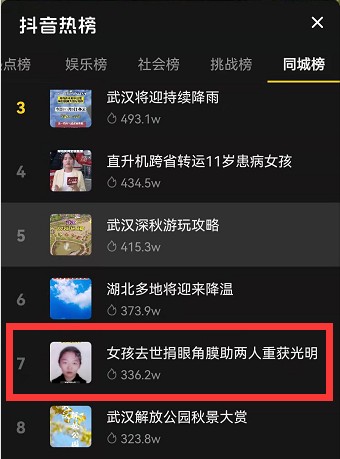 10月,湖北武漢一腫瘤科病房內(nèi),21歲的歐陽忻怡因病情惡化心臟停止跳動。遵照忻怡生前遺愿,工作人員摘取了她的一對眼角膜,歐陽忻怡的眼角膜,由武漢市紅十字會普瑞眼角膜庫接收,在武漢普瑞眼科醫(yī)院劉紅山教授及徐靜醫(yī)生的幫助下,成功為一位3歲男童及43歲女士帶來光明,完成了她臨終前的心愿。