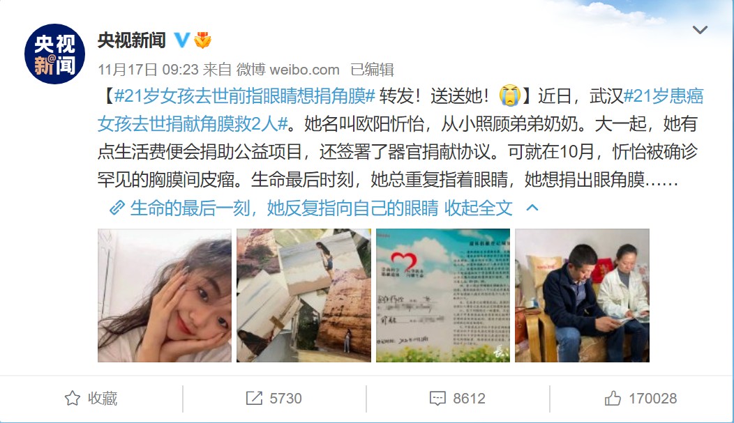 今年10月,歐陽忻怡被確診患有罕見的胸膜間皮瘤,癌細胞轉(zhuǎn)移至頭部,失去了手術(shù)機會。隨著病情的惡化,忻怡想起了之前簽署的那份器官捐獻協(xié)議,由于癌癥病人的很多器官不能使用,捐角膜成了她唯一的執(zhí)念。10月24日渾身插滿管子的忻怡已說不出話,卻總在重復(fù)一個動作:她指著眼睛,一直指著眼睛,想捐出眼角膜,盡管忻怡的父母心中百般不舍,但最終還是決定完成女兒的心愿。