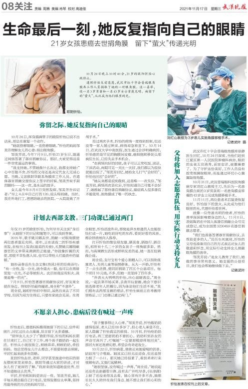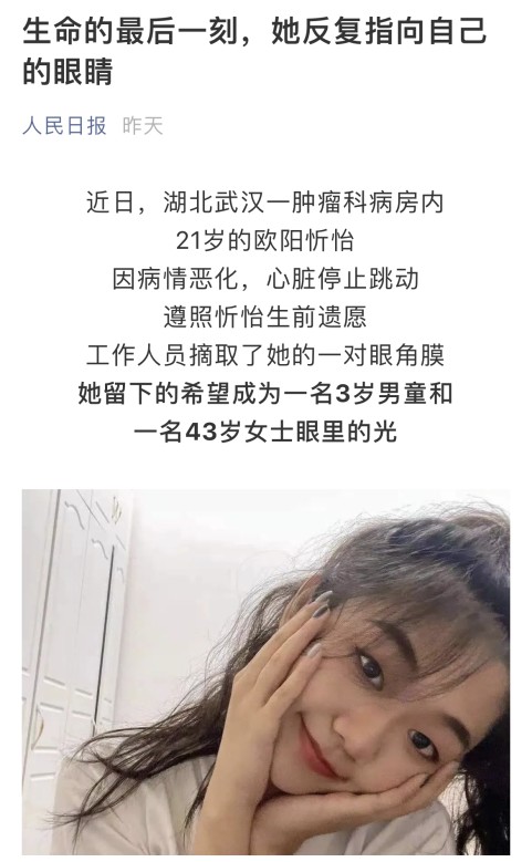 21歲女孩臨終大愛引人淚目,人民日報等媒體爭相報道