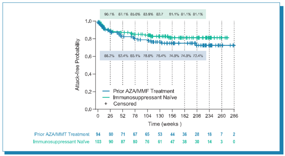 視神經脊髓炎譜系疾病(Neuromyelitis optica spectrum disorders,簡稱NMOSD)是一組罕見的中樞神經系統自身免疫性炎癥性疾病,臨床上多以嚴重的視神經炎(ON)和縱向延伸的長節段橫貫性脊髓炎(LETM)為特征表現,具有高復發和高致殘的特點,嚴重影響了患者的生命健康和生存質量[1]。 伊奈利珠單抗(inebilizumab)是全球首個獲批用于NMOSD治療的B細胞耗竭劑。2019年5月,翰森制藥獲得伊奈利珠單抗在中國的開發和商業化權利,并于2022年3月宣布獲中國國家藥品監督管理局上市批準,用于抗水通道蛋白4(AQP4)抗體陽性的NMOSD成人患者的治療,從而為國內NMOSD患者帶來希望。 N-MOmentum研究(NCT02200770)是一項多中心、雙盲、隨機、安慰劑對照的2/3期研究,旨在評價伊奈利珠單抗治療NMOSD成人患者的有效性和安全性。該試驗期間禁止患者使用免疫抑制劑,但在單克隆抗體出現之前,傳統免疫抑制劑治療(硫唑嘌呤、嗎替麥考酚酯等)是絕大部分NMOSD患者的首要選擇。因此,許多患者在接受伊奈利珠單抗治療前,很可能已接受過免疫抑制劑的治療。但是,此類患者使用伊奈利珠單抗的安全性、有效性尚未明確。 2022年10月26日~28日舉辦的第38屆歐洲多發性硬化癥治療和研究協會(ECTRIMS)大會上,公布了N-MOmentum研究的一項事后分析結果,研究者根據有無免疫抑制劑治療史對N-MOmentum研究中接受伊奈利珠單抗治療的AQP4+參與者進行分組,評估伊奈利珠單抗在這兩類患者中的長期治療結局,結果發現既往接受過傳統免疫抑制劑治療的AQP4+NMOSD患者,使用伊奈利珠單抗長期治療,其療效與安全性與無免疫抑制劑治療史的患者相比無顯著差異[2]。 在整個研究期間,接受伊奈利珠單抗治療的患者中,有94例既往接受過硫唑嘌呤/嗎替麥考酚(AZA/MMF)治療,103例未接受過免疫抑制劑治療。既往接受過AZA/MMF治療的患者年化復發率為11%,年化NMOSD相關住院率為15%,而無免疫抑制劑治療史的患者則分別為8%和12%。無論既往是否接受過免疫抑制劑治療,伊奈利珠單抗長期治療期間所有患者均維持較低的發作幾率(圖 1)。