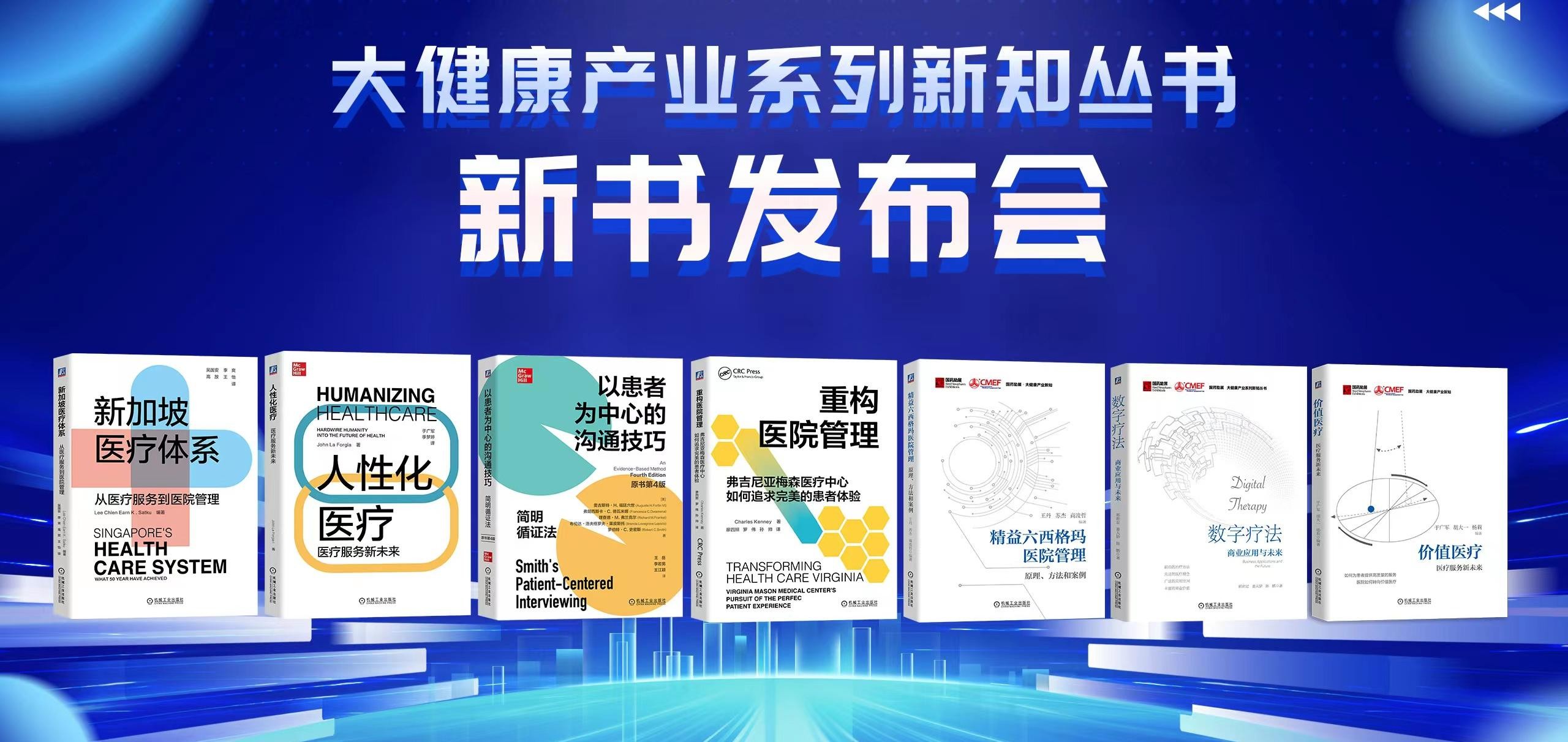 圖1 主辦方代表與論壇部分主講嘉賓合影 上圖從左至右:隋斌、姜天驕、涂宏鋼、丁傳軍、陳海娟、管弦悅、張鵬、羅偉、王雨楠 主辦方代表:丁傳軍 國藥勵展公司副總、陳海娟 機械工業出版社副社長 同時,在此次論壇上還發布了國藥勵展大健康產業系列新知叢書,包括《精益六西格瑪醫院管理:原理、方法和案例》《重構醫院管理:弗吉尼亞梅森醫療服務中心如何追求完美的患者體驗》《新加坡醫療體系:從醫療服務到醫院管理》《以患者為中心的溝通技巧》《數字療法的商業應用與未來》《人性化醫療》《價值醫療》,共計7本新書,該套叢書從醫療體系構建到醫院管理,從以患者為中心的人文關懷到醫患溝通技巧,從先進診療方法的商業應用到最優性價比的價值醫療,既有國內專家根據大健康行業熱點編寫的前沿圖書,也有從國外最新引進的醫療管理類圖書。國藥勵展大健康產業系列新知叢書自從2018年10月在CMEF上推出以來,受到了廣大讀者的認可和好評。該系列叢書是國藥勵展和機械工業出版社聯手,邀請組織眾多知名專家推出的,旨在傳播新知、聚焦熱點、把握趨勢、指導實戰,是國內全面闡述與推動大健康產業發展的權威、專業并注重實踐引領的行業必讀叢書,也是我們全面了解大健康產業的專業叢書。如圖2所示。