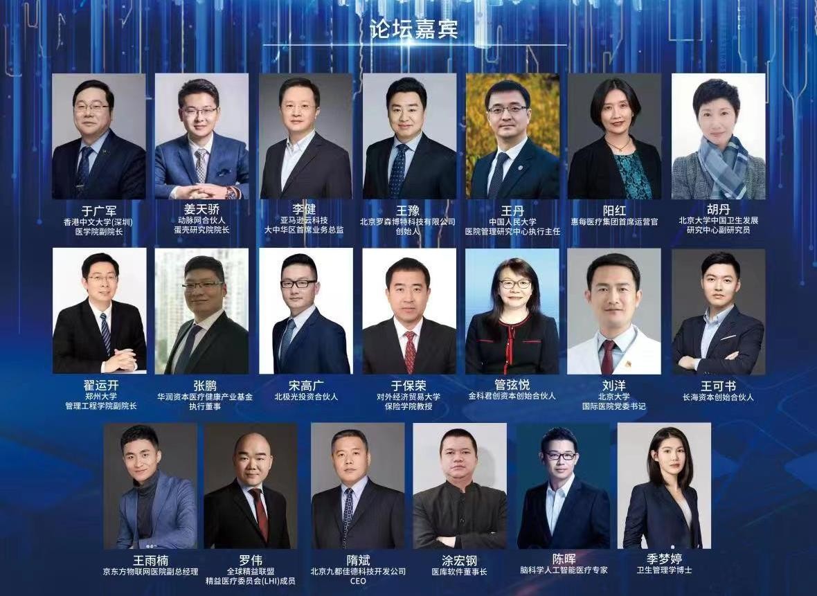 圖2 大健康產業系列新知叢書新書發布會 第十一屆智慧醫療高峰論壇主要由三個部分構成:即嘉賓的主題演講、圓桌論壇和新書發布會,此次論壇的參會嘉賓包括:香港中文大學(深圳)醫學院副院長于廣軍、華潤資本醫療健康產業基金執行董事張鵬、動脈網合伙人姜天驕、亞馬遜云科技大中華區首席業務總監李健、北京航空航天大學生物與醫學工程學院院長助理王豫、鄭州大學管理工程學院副院長翟運開、北極光合伙人宋高廣、金科君創資本創始合伙人管弦悅、長海資本創始合伙人王可書、北京九都佳徳科技有限公司CEO隋斌、中國人民大學醫院管理研究中心執行主任王丹、惠每醫療集團首席運營官陽紅、對外經濟貿易大學保險學院教授于保榮、北京大學中國衛生發展研究中心副研究員胡丹、全球精益聯盟精益醫療委員會(LHI)成員羅偉、腦科學人工智能醫療專家陳暉、北京大學國際醫院黨委書記劉洋、醫庫軟件董事長涂宏鋼、京東方物聯網醫院副總經理王雨楠、衛生管理學博士季夢婷。如圖3所示。