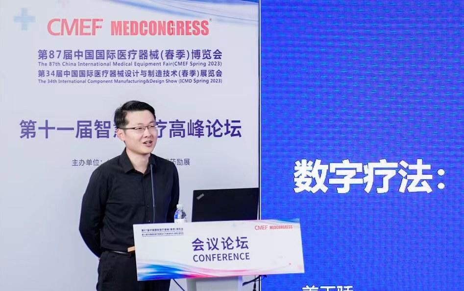 圖4 王雨楠 姜天驕現場分享了自己對“數字療法的商業應用和未來”的了解和看法。他認為,如果要進入數字療法領域,核心要關注的就是商業模式的構建。商業模式的前提有第一點就是一定要有臨床效果。第二點是患者端要有及時明顯的用戶感知,第三點要有用戶付費這個重要基礎。圖5 姜天驕正在主題演講。