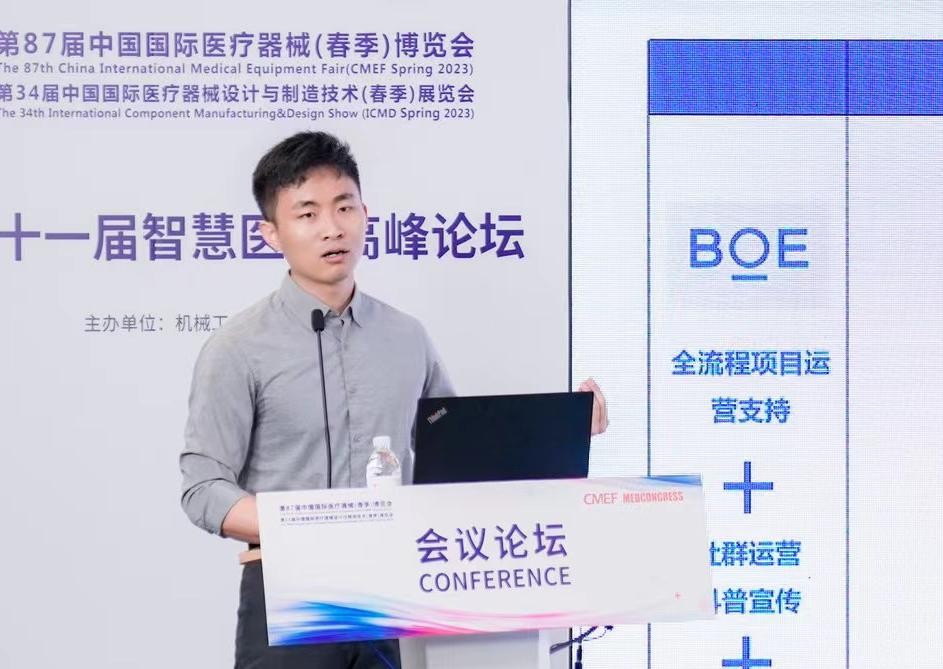 圖3 參加此次論壇的全部嘉賓 在主題演講環節中,王雨楠表示,互聯網大大改變了現代醫療醫藥行業,京東方探索出了一條“數字科技+醫療”的醫工融合創新之路,打造以健康管理為核心、醫工產品為牽引、數字醫院和康養社區為支撐的全周期健康服務閉環,為人們提供優質、便捷的健康醫療服務。如圖4 嘉賓王雨楠正在主題演講。