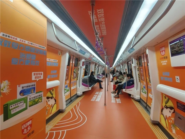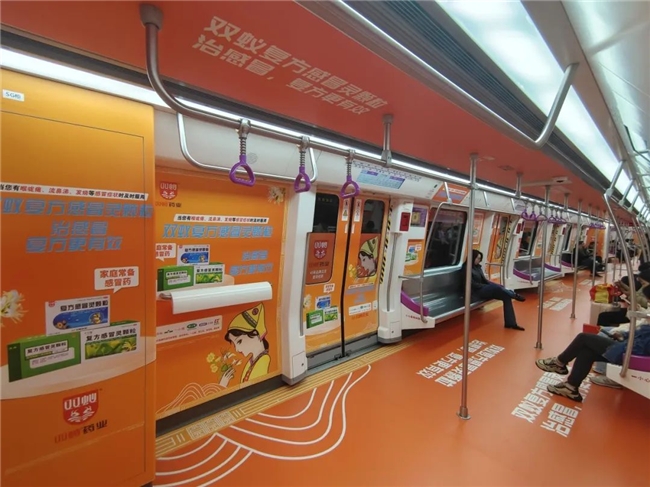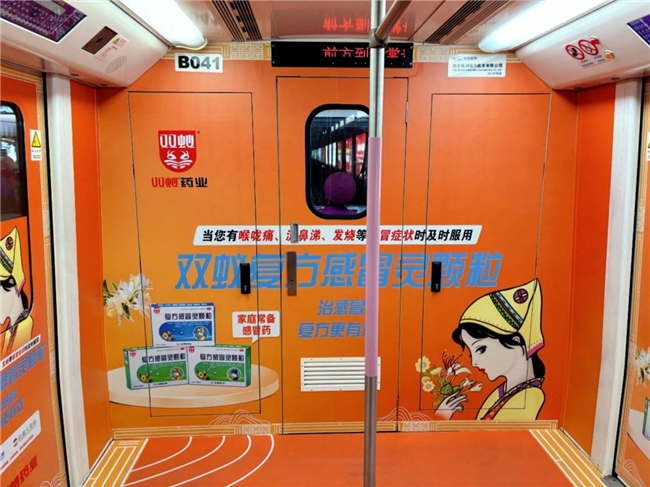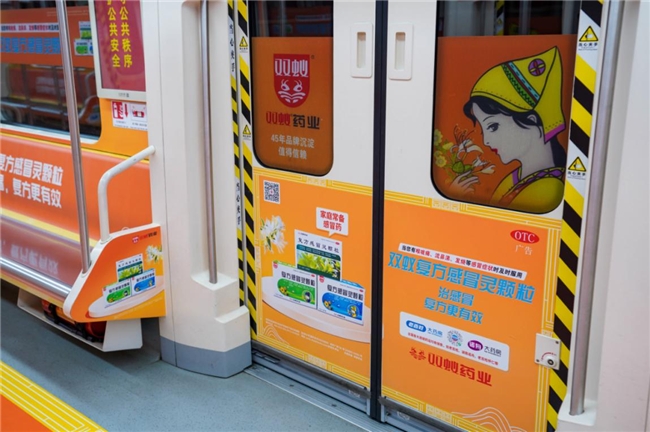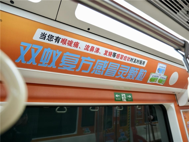 本次地鐵主題專(zhuān)列在車(chē)廂內(nèi),門(mén)貼、車(chē)身、頂圖、地貼等處,集中展示了雙蟻復(fù)方感冒靈顆粒的產(chǎn)品信息,通過(guò)地鐵的廣泛影響力,快速、清晰地傳達(dá)給了消費(fèi)者,打造更具影響力的品牌產(chǎn)品形象。