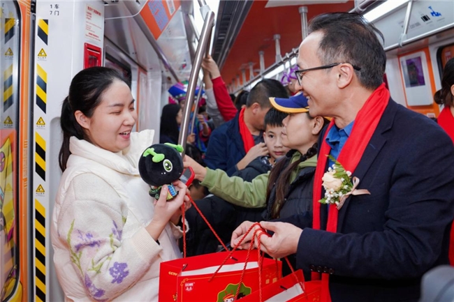 王波董事長(zhǎng)向乘客發(fā)放禮品