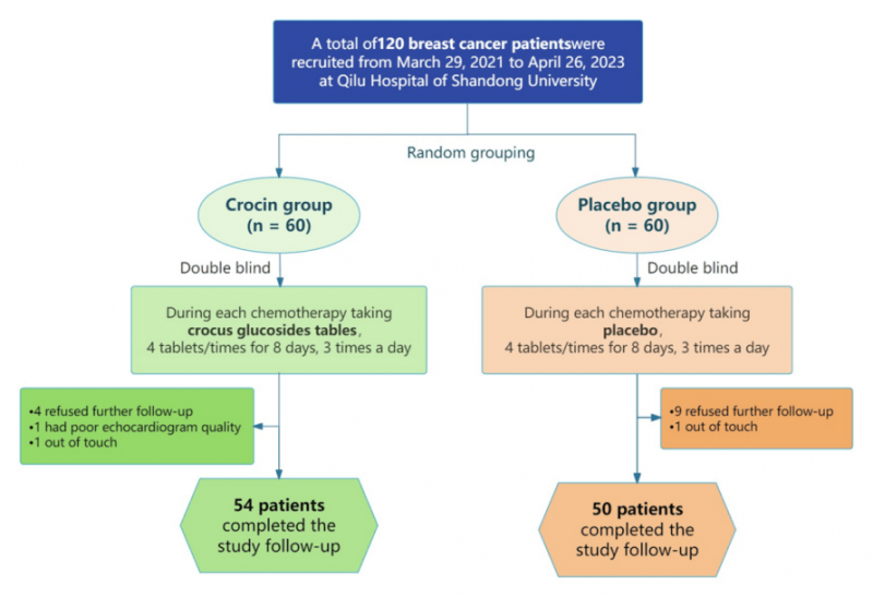 作者:劉曉玲,宋雯雯,李萌萌,張瑜,徐銘俊,包烏云,黎莉,張梅*,山東大學齊魯醫院 通訊作者:張梅 研究背景 乳腺癌是全球女性發病、殘疾、致死的首要原因,全球乳腺癌患病人群高達120萬,是女性癌癥死亡的最常見原因,對女性健康造成非常嚴重的威脅。乳腺癌治療的進步提高了早期乳腺癌患者的生存率,然而,與之相關的急性和慢性心血管并發癥也不容忽視。由于腫瘤治療相關心血管毒性(Cancer therapy-related cardiovascular toxicity,CTR-CVT)已經成為乳腺癌治療患者重要死亡原因之一,癌癥幸存者心血管疾病的進展削弱了腫瘤治療進步帶來的生存率的提高。 目前關于腫瘤治療所致的心臟損害早期預防仍缺乏有效的藥物,基礎研究證實中藥西紅花具有抗炎、抗氧化應激、減少蒽環類藥物心肌損害等作用,西紅花總苷片是否能夠用于乳腺癌治療患者心肌損害的預防仍需進一步研究。 研究目的與研究方案 ProtECtion研究是一項隨機、雙盲、平行、安慰劑對照臨床試驗。納入擬行化療的乳腺癌患者120例,隨機分為西紅花(Crocin)組和安慰劑(Placebo)組。受試者于每次化療期間聯合應用西紅花總苷片或安慰劑,化療前1天開始服用,4片/次,每日3次,共8天。分別于3個月和6個月進行隨訪,共隨訪6個月。主要研究終點:6個月時,超聲心動圖測量的左心室射血分數(LVEF)與基線相比的差值、左心室整體縱向應變(LVGLS)較基線相對下降幅度;次要研究終點包括:3個月時,超聲心動圖測量的LVEF與基線相比的差值、LVGLS較基線相對下降幅度;3個月和6個月時,超聲心動圖測量的LVEF、GLS;6個月內LVEF下降至<50%或GLS較基線相對下降幅度≥15%的發生率、血清肌鈣蛋白水平超過正常值上限、氨基末端B型腦鈉尿肽原(NT-proBNP)高于正常年齡參考值的發生率、新出現的嚴重心律失常的發生率。 注:LVEF較基線差值(reduced percentage points of LVEF)=隨訪時LVEF -基線時LVEF ; LVGLS較基線相對下降幅度(the relative decline in LVGLS from baseline)=(隨訪時LVGLS-基線LVGLS)/基線LVGLS基線 *100% 主要研究結果 共104例受試者完成研究,其中西紅花組54例、安慰劑組50例(圖1)。兩組患者的基線臨床特征無統計學差異。