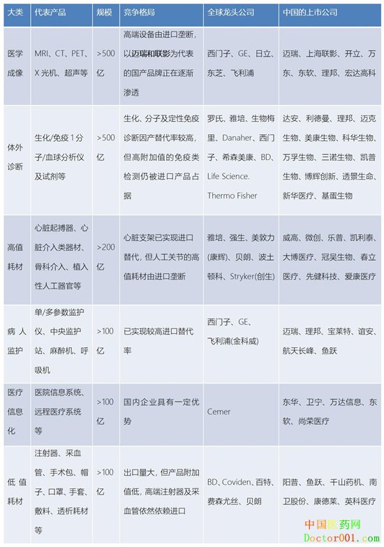 國內主張進口替代 千億市值企業浮現 國務院出臺的《中國制造2025》中,將生物醫藥及高性能醫療器械列為十大重點發展領域之一。當前,中國加速推進醫療器械產品的進口替代和自主創新。 從2014年藥監局《創新醫療器械特別審批程序(試行)》實行以來,截止2019年2月末,共有218項產品納入創新器械特別審批,共57個創新器械獲批,其中2017-18年呈現爆發式增長,創新產品審批時間大量壓縮。同時中國資本市場方面,2018年醫療保健設備與技術融資201起,共296.05億元,創歷史新高。 據中國醫采網統計,截止到2019年3月13日,我國A股市場總計有49家醫療器械生產企業上市公司(文末附名單)。2018年新增4家——邁瑞醫療、振德醫療、明德生物和愛朋醫療。其中,被稱為醫療器械界“華為”的邁瑞醫療總市值已接近1600億,成為國內行業領跑企業。 多份行業報告顯示,近年來,在醫學成像、體外診斷、高值耗材、低值耗材、病人監護、醫療信息化等六大細分領域中,中國醫療器械的市場份額都在不斷上升。 中國醫療器械各細分領域競爭規模和市場格局
