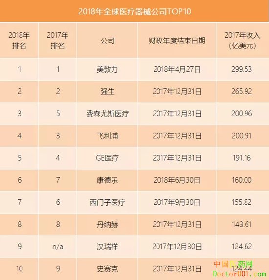 醫療器械行業網站Medical Design&Outsourcing每年會根據各公司的金融監管機構備案文件以及在醫療器械業務方面的營收情況進行全球100大醫療器械公司的排名。根據其發布的2018年榜單,行業十大企業全部集中于歐美地區。