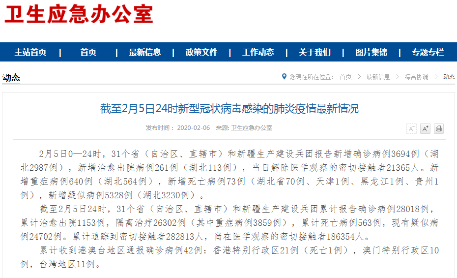 2月5日0—24時,31個省(自治區(qū)、直轄市)和新疆生產(chǎn)建設(shè)兵團(tuán)報告新增確診病例3694例(湖北2987例),新增治愈出院病例261例(湖北113例),當(dāng)日解除醫(yī)學(xué)觀察的密切接觸者21365人。新增重癥病例640例(湖北564例),新增死亡病例73例(湖北省70例、天津1例、黑龍江1例、貴州1例),新增疑似病例5328例(湖北3230例)。![]() 截至2月5日24時,31個省(自治區(qū)、直轄市)和新疆生產(chǎn)建設(shè)兵團(tuán)累計報告確診病例28018例,累計治愈出院1153例,隔離治療26302例(其中重癥病例3859例),累計死亡病例563例,現(xiàn)有疑似病例24702例。累計追蹤到密切接觸者282813人,尚在醫(yī)學(xué)觀察的密切接觸者186354人。 累計收到港澳臺地區(qū)通報確診病例42例:香港特別行政區(qū)21例(死亡1例),澳門特別行政區(qū)10例,臺灣地區(qū)11例。 (責(zé)任編輯:Doctor001) |