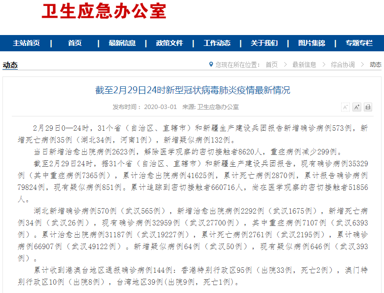 2月29日0—24時,31個。ㄗ灾螀^(qū)、直轄市)和新疆生產(chǎn)建設(shè)兵團報告新增確診病例573例,新增死亡病例35例(湖北34例,河南1例),新增疑似病例132例。 當日新增治愈出院病例2623例,解除醫(yī)學(xué)觀察的密切接觸者8620人,重癥病例減少299例。 ![]() 截至2月29日24時,據(jù)31個。ㄗ灾螀^(qū)、直轄市)和新疆生產(chǎn)建設(shè)兵團報告,現(xiàn)有確診病例35329例(其中重癥病例7365例),累計治愈出院病例41625例,累計死亡病例2870例,累計報告確診病例79824例,現(xiàn)有疑似病例851例。累計追蹤到密切接觸者660716人,尚在醫(yī)學(xué)觀察的密切接觸者51856人。 湖北新增確診病例570例(武漢565例),新增治愈出院病例2292例(武漢1675例),新增死亡病例34例(武漢26例),現(xiàn)有確診病例32959例(武漢27700例),其中重癥病例7107例(武漢6393例)。累計治愈出院病例31187例(武漢19227例),累計死亡病例2761例(武漢2195例),累計確診病例66907例(武漢49122例)。新增疑似病例64例(武漢50例),現(xiàn)有疑似病例646例(武漢393例)。 累計收到港澳臺地區(qū)通報確診病例144例:香港特別行政區(qū)95例(出院33例,死亡2例),澳門特別行政區(qū)10例(出院8例),臺灣地區(qū)39例(出院9例,死亡1例)。 (責(zé)任編輯:Doctor001) |