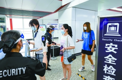 地鐵1號(hào)線(xiàn)竹山路站入口處,工作人員嚴(yán)格查驗(yàn)健康碼、檢測(cè)體溫。 南報(bào)融媒體記者 段仁虎攝