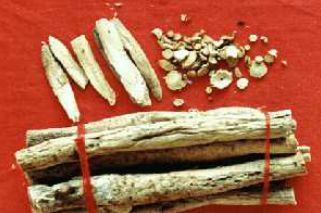 【標題】 黃芪 【拼音】 Huangqi 【概述】 為豆科植物蒙古黃芪Astragalus memeranaceus (Fisch.)Bge.var.mongholicus (Bge.)Hsiao或膜莢黃芪A.membranaceus(Fisch.)Bge. 的根。主產于內蒙古、山西、黑龍江等地。春秋二季采挖,除去須根及根頭,曬干,切片,生用或蜜炙用。 【性味歸經】 甘,微溫。歸脾、肺經。 【功效】 健脾補中,升陽舉陷,益衛固表,利尿,托毒生肌。 【應用】 1.脾氣虛證。本品甘溫,善入脾胃,為補中益氣要藥。脾氣虛弱,倦怠乏力,食少便溏者,可單用熬膏服,或與黨參、白術等補氣健脾藥配伍。因其能升陽舉陷,故長于治療脾虛中氣下陷之久瀉脫肛,內臟下垂。常與人參、升麻、柴胡等品同用,如補中益氣湯(《脾胃論》)。若脾虛水濕失運,以致浮腫尿少者,本品既能補脾益氣,又能利尿消腫,標本兼治,為治氣虛水腫之要藥,常與白術、茯苓等利水消腫之品配伍。本品又能補氣生血,治血虛證亦常與補血藥配伍,如當歸補血湯(《蘭室秘藏》)以之與當歸同用。對脾虛不能統血所致失血證,本品尚可補氣以攝血,常與人參、白術等品同用,如歸脾湯(《濟生方》)。對脾虛不能布津之消渴,本品能補氣生津,促進津液的生成與輸布而有止渴之效,常與天花粉、葛根等品同用,如玉液湯(《醫學衷中參西錄》)。 2.肺氣虛證。本品入肺又能補益肺氣,可用于肺氣虛弱,咳喘日久,氣短神疲者,常與紫菀、款冬花、杏仁等祛痰止咳平喘之品配伍。 3.氣虛自汗證。脾肺氣虛之人往往衛氣不固,表虛自汗。本品能補脾肺之氣,益衛固表,常與牡蠣、麻黃根等止汗之品同用,如牡蠣散(《和劑局》)。若因衛氣不固,表虛自汗而易感風邪者,宜與白術、防風等品同用,如玉屏風散(《丹溪心法》)。 4.氣血虧虛,瘡瘍難潰難腐,或潰久難斂。本品以其補氣之功還能收托毒生肌之效。瘡瘍中期,正虛毒盛不能托毒外達,瘡形平塌,根盤散漫,難潰難腐者,可用本品補氣生血,扶助正氣,托膿毒外出,常與人參、當歸、升麻、白芷等品同用,如托里透膿散(《醫宗金鑒》)。潰瘍后期,因氣血虛弱,膿水清稀,瘡口難斂者,用本品補氣生血,有生肌斂瘡之效。常與人參、當歸、肉桂等品同用,如十全大補湯(《和劑局方》)。 此外,痹證、中風后遺癥等氣虛而致血滯,筋脈失養,癥見肌膚麻木或半身不遂者,亦常用本品補氣以行血。治療風寒濕痹,宜與川烏、獨活等祛風濕藥和川芎、牛膝等活血藥配伍。對于中風后遺癥,常與當歸、川芎、地龍等品同用,如補陽還五湯(《醫林改錯》)。 【用法用量】 煎服,9~30g。蜜炙可增強其補中益氣作用。 【臨床研究】 1.化學成分:本品主要含苷類、多糖、黃酮、氨基酸、微量元素等。 2.藥理作用:黃芪能促進機體代謝、抗疲勞、促進血清和肝臟蛋白質的更新;有明顯的利尿作用,能消除實驗性腎炎尿蛋白;能改善貧血動物現象;能升高低血糖,降低高血糖;能興奮呼吸;能增強和調節機體免疫功能,對干擾素系統有促進作用,可提高機體的抗病力;對流感病毒等多種病毒所致細胞病變有輕度抑制作用,對流感病毒感染小鼠有保護作用;有較廣泛的抗菌作用;黃芪在細胞培養中,可使細胞數明顯增多,細胞生長旺盛,壽命延長;能增強心肌收縮力,保護心血管系統,抗心率失常,擴張冠狀動脈和外周血管,降低血壓,能降低血小板粘附力,減少血栓形成;還有降血脂、抗衰老、抗缺氧、抗輻射、保肝等作用。 3.臨床研究: 據報道,以黃芪50g煎服,每日1劑,治療過敏性鼻炎、慢性鼻炎及預防小兒上呼吸道感染等,效果頗佳(中醫雜志,2000,6:331)。]每日口服黃芪提取液2ml(含生藥2g),預防小兒上吸呼道感染100例,有效率94%(哈爾濱醫科大學學報,1993,5:366);用黃芪治療92例缺血性心臟病;其緩解心絞痛,改善心電圖及心阻抗圖等療效均優于心痛定和丹參(中國免疫學雜志,1989,2:119-120)。本品還有用于小兒哮喘、冠心病、關節炎、缺血性腦血管病、慢性腎炎、慢性肝炎、產后非感染性發熱、過敏性鼻炎等疾病者。 4.不良反應:黃芪注射液有導致皮疹、過敏性休克的報道;有12例妊娠7個月以上的孕婦,因連續服用黃芪15天,總量300g以上,結果過期妊娠8例,產程延長6例,胎盤遲剝3例,會陰側切4例,產鉗助產1例,胎兒過大行剖腹產1例,胎兒體重3500g~4600g。 【參考文獻】 1.《神農本草經》:“主治癰疽,久敗瘡,排膿止痛……補虛。” 2.《本草匯言》:“補肺健脾,實衛斂汗,驅風運毒之藥也。” 3.《醫學衷中參西錄》:“能補氣,兼能升氣,善治胸中大氣(即宗氣……)下陷。” 【圖片】 內蒙古黃芪 ![]() 扁莖黃芪 ![]() 膜夾黃芪 ![]() 膜莢黃芪 ![]() 膜莢黃芪《本草綱目》 ![]() 藥材黃芪 ![]() 藥材黃芪橫切面 ![]() 蒙古黃芪 ![]() 蒙古黃芪《中藥學》 ![]() 黃芪 ![]() 黃芪植株花葉 ![]() 黃芪藥材及飲片 ![]() 【表格】 黃芪《中藥歌決》 【歌決】 黃芪甘溫歸肺脾,斂汗固表益元氣; 陽虛水腫糖尿病,脾虛腹瀉瘡瘰疬。 (責任編輯:Doctor001) |