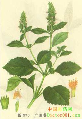 【炮制】 1.廣藿香 《產育寶慶集》:“去枝杖,以水洗凈,去沙塵。”“以手搓細用。”《藥品化義》:“曬干,取葉同梗用。”現行,取原藥材,除去殘根老莖及雜質,先抖下葉,篩凈另放,將莖洗凈,潤透切段,低溫干燥或曬干。再與葉混勻。 2.廣藿香梗 《普濟方》:“去根,洗。”取藿香老梗,除去雜質,洗凈,撈出,悶潤至透,切斜片,低溫干燥或曬干。 3.廣藿香葉 《湯液本草》:“去枝梗,用葉。”取藿香揀凈雜質,去梗取葉,篩去灰屑。 貯干燥容器內,密閉,置陰涼干燥處,防潮。 【附方】 1.治傷寒頭疼,寒熱,喘咳,心腹冷痛,反胃嘔惡,氣瀉霍亂,臟腑虛鳴,山嵐瘴瘧,遍身虛腫,產前、產后血氣刺痛,小兒疳傷 大腹皮、白芷、紫蘇、茯苓(去皮)各一兩,半夏曲、白術、陳皮(去白〕、厚樸(去粗皮,姜汁炙)、苦梗各二兩,藿香(去土)三兩,甘草(炙)二兩半。上為細末,每服二錢,水一盞,姜三片,棗一枚,同煎至七分,熱服。如欲出汗,衣被蓋,再煎并服。(《局方》藿香正氣散) 2.治暑月吐瀉 滑石(炒)二兩,藿香二錢半,丁香五分。為末,每服一二錢,淅米泔調服。(《禹講師經驗方》) 3.治霍亂吐瀉 陳皮(去白)、藿香葉(去土)。上等分,每服五飯,水一盞半,煎至七分,溫服,不拘時候。(《百一選方》) 4.治氣壅煩熱或渴 藿葉一斤(切),蔥白一握(切)。上藥豆豉汁煮,調合作羹食之。(《圣惠方》藿葉羹) 5.治小兒熱吐不止 正雅連七分(姜汁炒),紫厚樸(姜汁炒)、藿香葉各一錢,生姜三片,大棗三枚。水煎,熱服。(《幼幼集成》藿連湯) 6.治脾胃虛有熱,面赤,嘔吐誕嗽,及轉(筋)過度者 麥門冬(去心,焙),半夏曲、甘草(炙)各半兩,藿香葉一兩。上為末,每服五分至一錢,用水一盞半,煎至七分,食前溫服。(《小兒藥證直訣》藿香散) 7.治胸膈有痰,脾胃積冷,噫醋吞酸,不思飲食 藿香葉一分,半夏五兩(生姜汁浸一宿,焙干),丁香半兩。上藥搗羅為末,面糊和丸,如梧桐子大。每服十五丸,不拘時候,溫生姜湯下。(《圣濟總錄》藿香半夏丸) 8.治脾胃虛弱,不進飲食,嘔吐不待腐熟 藿香、丁香、人參各二錢五分,橘紅五錢。上藥為細末,每服二錢,水一大盞,生姜-片,同煎至七分,食前和滓冷服。(《脾胃論》藿香安胃散) 9.治胎氣不安,氣不升降,嘔吐酸水 香附、藿香、甘草各二錢 為末,每服二錢,入鹽少許,沸湯調服之。(《圣惠方》) 10.治上呼吸道感染發熱 藿香10g,香薷6g,野菊花15g,青蒿10g。制成沖劑,每6h1次,每次15g,開水沖服。(《江蘇中醫》1987,(7):11) 11.治瘧 高良姜、藿香各半兩。上為末,均分為四服,每服以水一碗,煎至一盞,溫服,未定再服。(《雞峰普濟方》藿香散) 12.治風客陽經,頭重疼痛,及偏湊一邊,繞額角痛 藿香半兩,草烏頭半兩(炮,去皮、臍),烏頭一兩(炮裂,去皮、臍),乳香三皂子許(研)。上四味,搗研極細,每服一字,至半錢,好茶調下,發時服。(《圣濟總錄》藿香散) 13.治膽熱移腦,復感風寒,致患鼻淵,鼻流黃色濁涕者 藿香連枝葉八兩,研細末,以雄豬膽汁和丸,如梧桐子大。每服五錢,食后用蒼耳子湯送下,或以黃酒送下。(《醫宗金鑒》奇授藿膽丸) 14.香口去臭 藿香洗凈,煎湯,時時噙漱。(《摘玄方》) 15.治膈熱口舌生瘡,咽喉腫痛 藿香葉、石膏(水飛)、山梔仁各五分,甘草(炙)一錢。上為極細末,新汲水調服。(《瘍科選粹》) 16.治冷露瘡爛 藿香葉、細茶等分。燒灰,油調涂葉上貼之。(《包會應驗方》) 17.治手足癬 藿香30g,黃精、生軍、皂礬各12g。將上藥浸于米醋1000ml內7~8d,去渣,將患部浸入藥液內,每日1~3次,每次20~30min。次數愈多,時間愈長,效果愈佳。(《江蘇中醫》1964,(5):8) 【藥論】 1.論藿香醒牌開胃之功 ①倪朱謨:“藿香,溫中快氣,開胃健脾之藥也。然性味辛溫,稟清和芬烈之氣,故主脾胃,進飲食,辟穢氣為專用。凡嘔逆惡心而泄瀉不食,或寒暑不調而霍亂吐利,或風水毒腫而四末虛浮,或山嵐蠱瘴而似瘧非瘧,或濕熱不清而吞酸吐酸,或心脾郁結而積聚疼痛,是皆脾肺虛寒之證,非此莫能治也。”(《本草匯言》)②賈所學:“(藿香)其氣芳香,善行胃氣,以此調中。治嘔吐霍亂,以此快氣,除穢惡痞悶。且香能和合五臟,若脾胃不和,用之助胄而進食,有醒脾開胃之功。”(《藥品化義》)③張山雷:“藿香,清芬微溫,善理中州濕濁痰涎,為醒脾開胃、振動清陽妙品。”又“藿香芳香而不嫌其猛烈,溫煦而不偏于燥烈,能祛除陰霾濕邪,而助脾胃正氣,為濕困脾陽,倦怠無力,飲食不甘,舌苔濁膩者最捷之藥。”(《本草正義》) 2.論藿香辛能散氣去惡氣 王劍賓:“《別錄》主治風水毒腫,以辛能散氣而使利水消腫也。氣積不化則為惡氣,辛能散氣,故可祛惡氣。氣阻而吐瀉為霍亂,藿香辛溫散氣,故能止霍亂。心腹氣阻則痛,故散結利氣可以止痛。蘇頌以藿香為脾胃吐逆之要藥,元素助胃氣,開胃口,進飲食,以其能散惡氣,使脾胃安和也。”(《國藥詮證》) 【圖片】 廣藿香 ![]() 廣藿香《本草圖苑》 廣藿香《本草綱目》 ![]() 藥材廣藿香