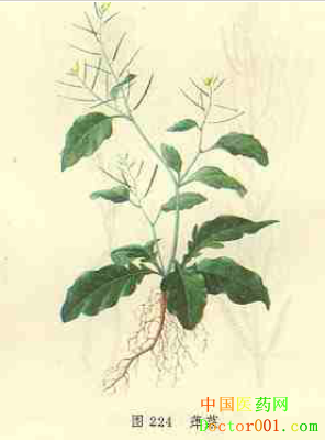 【標(biāo)題】 蔊菜 【拼音】 Hǎn Cài 【英文】 Indian Rorippa Herb 【拉丁文】 1.Rorippa indica(L.)Hiern[Sisymbrium indicum L.]2.Rorippa dubia (Pers.)Hara[R.montana (Wall.)Small] 【異名】 辣米菜、野油菜、塘葛菜、干油菜、石豇豆、雞肉菜、田葛菜、江剪刀草、野雪里蕻、野芥草、野菜花、山芥菜、獨根菜、山蘿卜、金絲莢 【性味】 味辛;苦;性微溫 【歸經(jīng)】 肺;肝經(jīng) 【功效】 祛痰止咳;解表散寒;活血解毒;利濕退黃。主咳嗽痰喘;感冒發(fā)熱;麻疹透發(fā)不暢;風(fēng)濕痹痛;咽喉腫痛;疔瘡癰腫;漆瘡;經(jīng)閉;跌打損傷;黃疸;水腫 【藥用】 為十字花科植物蔊菜和無瓣蔊的全草。 【應(yīng)用】 治療慢性氣管炎:用從蔊菜中提取的有效成分蔊菜素(Rorifone)內(nèi)服,每日200-300mg,10天治療100例,20天治療98例。前者有效率為80%,臨床控制率為4%,顯效率為21%;后者有效率為90%,臨床控制率為 8%,顯效率為41%。實踐表明本品祛痰作用明顯,其次是止咳、平喘,較蔊菜水煎劑(3兩/日)療效為高,副作用也明顯降低。治程中可有口干、胃部不適、頭暈等反應(yīng),但均輕微短暫,不影響服藥。 【用法用量】 內(nèi)服:煎湯,10-30g,鮮品加倍;或搗絞汁服。外用:適量,搗敷。 【形態(tài)】 1.蔊菜,一年生或二年生草本。植株較粗壯,高20-50cm,無毛或具疏毛。莖單一或分枝,直立斜升。葉形多變化,基生葉和莖下部葉具長柄;葉片通常大頭羽狀分裂,長4-10cm,寬1.5-2cm,頂裂片大,邊緣具不規(guī)則牙齒,側(cè)裂片1-3對,上部葉片寬披針形或匙形,具短柄或耳狀抱莖,邊緣具疏齒。總狀花序頂生或側(cè)生,開花時花序軸逐漸向上延伸,花小,多數(shù);萼片4,直立,淺黃色而微帶黃綠色,光滑無毛,災(zāi)區(qū)披針形或卵狀長圓形,長2-4mm,先端內(nèi)凹;花瓣4,鮮黃色,寬匙形或長倒卵形,長2.5-4mm,全緣,基部具有短而細的爪;雄蕊6,4長2短,長雄蕊長約3mm,短雄蕊長約2.5mm;雌蕊1,子房圓柱形,長2.5-3mm,花柱短粗,柱頭略膨大,頂部扁平。長角果線狀圓柱形,較短而粗壯,長1-2cm,直立或稍彎曲,成熟時果瓣隆起。種子每室2行,多數(shù),淡褐色,寬橢圓形,近三角形或不規(guī)則多角形,長0.5-0.7mm,表面有凹陷的大網(wǎng)紋。花期4-5月(8-9月偶有開花),花后果實漸次成熟。 2.無瓣蔊菜,一年生或二年生草本,高10-30cm。植株光滑無毛,較柔弱。莖直立或呈鋪散狀分枝。葉抽薄;基生葉及莖下部葉具長柄,葉柄長3-5cm,兩側(cè)具窄翼;葉片常為大頭羽狀分裂,長柄,葉柄長3-5cm,頂裂片大,寬卵形或長橢圓形,邊緣具大小不整齊鈍鋸齒,側(cè)裂片1-3對,寬披針形或長橢圓形,由上至下漸小;莖上部寬披針形或長卵形,長3-6cm,寬1.5-2.5cm,邊緣具不整齊鋸齒或近全緣,基部具短柄或無柄。總狀花序頂生或側(cè)生,開花后,花序漸延長;花無瓣或偶有退化的花瓣;萼片4,淡黃綠色,披針形,先端微帶紫色并內(nèi)凹,長2.5-3mm,雄蕊6,4長2短,長雄蕊長約3mm,短雄蕊長約2.5mm;雌蕊1,子房圓柱形,花柱不明顯,柱頭盤狀。長角果細圓柱形,細長而直,長1.5-3cm;果瓣近扁平,光滑或稀有柔毛。種子每室1行,淡褐色,細小,多數(shù),寬橢圓形、長方形或方形或不規(guī)則多角形。表面有小疣點及細網(wǎng)紋。花期4-9月,果期5-10月。 【生態(tài)環(huán)境】 生于海拔500-3700m間的山坡路旁、山谷、河邊潮濕地、園圃、田野潮濕處。 【產(chǎn)地】 分布于陜西、甘肅、江蘇、浙江、福建、湖北、廣東、廣西等地。 【品種考證】 出自《本草綱目》1.《本草綱目拾遺》:《字林》云,蔊、辛菜,南人食之,去冷氣。 2.《綱目》:蔊菜,生南地,田園間小草也。冬月布地叢生,長二、三寸,柔梗細葉,二月開細花,黃色,結(jié)細角長一、二分,角內(nèi)有細子。南人連根葉拔而食之,味極辛辣,呼為辣米菜。沙地生者尤伶仃。 【化學(xué)成分】 1.蔊菜,全草含蔊菜素(rorifone),有機酸、黃酮類化合物及微量生物堿。 2.無瓣蔊菜,全草含蔊菜素、蔊菜酰胺(rorifamide)。 【理化鑒別】 薄層層析:取本品10g,加水100ml,煮沸15min,濾過。濾液濃縮至約0.5ml加無水乙醇2ml溶解后濾過,濾液于蒸發(fā)皿中蒸干,加少許氯仿溶解后供點樣,以蔊菜素氯仿溶液為對照,在硅膠G板上,分別點樣品液及對照品溶液適量,以醋酸乙酯為展開劑,展后晾干,置碘蒸氣中或噴碘化鉍鉀試劑,樣品液色譜在與對照品溶液色譜的相應(yīng)位置有相同的紅棕色斑點。 【藥理作用】 1.止咳、祛痰作用:小鼠口服蔊菜素60mg/kg沒有止咳作用(二氧化硫引咳法)。家兔口服有祛痰作用(酚紅法)。抗菌作用用平板雙倍稀釋法最終濃度為每ml5mg時,對4株肺炎球菌及4株流感桿菌均有抑制作用。有祛痰作用。用平板稀釋,5mg/ml濃度對肺炎球菌及流感均有抑制作用。 2.毒性:對小鼠灌胃的LD50為402.3mg/kg;給兔60mg/kg灌胃,共10天,心電圖檢查或外觀觀察,均未見毒性反應(yīng)。 3.降壓作用:印度蔊草根水提物有降壓作用:動物血管灌流試驗1:100000可使血管擴張,而1:10000則使血管收縮。 【采收加工】 5-7月采收全草,鮮用或曬干。 【性狀】 顯微鑒定:1.印度蔊菜莖橫切面:表皮細胞1列,細胞扁平長方形;角質(zhì)層外緣細波狀。皮層由5-12列大小不一的類圓形薄壁細胞組成。維管束外韌型;韌皮部外方纖維單個散在或1-2列節(jié)向排列;木質(zhì)部導(dǎo)管束由纖維切向連接成環(huán)。髓部寬廣,同類圓形薄壁細胞組成。 2.葉表面觀:表皮細胞長多角形、類長方形、類方形或長條形,垂周壁