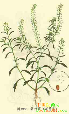 【標(biāo)題】 葶藶子 【拼音】 Tinglizi 【概述】 為十字花科植物獨(dú)行菜 Lepidium apetalum Willd.或播娘蒿 Descurinia sophia (L.) Webb ex Prantl的成熟種子。前者稱“北葶藶”,主產(chǎn)于河北、遼寧、內(nèi)蒙古、吉林等地;后者稱“南葶藶”,主產(chǎn)于江蘇、山東、安徽、浙江等地。夏季果實(shí)成熟時(shí)采割植株,曬干,搓出種子,除去雜質(zhì),生用或炒用。 【性味歸經(jīng)】 苦、辛,大寒。歸肺、膀胱經(jīng)。 【功效】 瀉肺平喘,利水消腫。 【應(yīng)用】 1.痰涎壅盛,喘息不得平臥。本品苦降辛散,性寒清熱,專瀉肺中水飲及痰火而平喘咳。常佐大棗以緩其性,如葶藶大棗瀉肺湯(《金匱要略》)。還常配蘇子、桑白皮、杏仁等共用。 2.水腫,懸飲,胸腹積水,小便不利。本品泄肺氣之壅閉而通調(diào)水道,利水消腫。治腹水腫滿屬濕熱蘊(yùn)阻者,配防己、椒目、大黃,即已椒藶黃丸(《金匱要略》);治結(jié)胸、胸水,腹水腫滿,配杏仁、大黃、芒硝,即大陷胸丸(《傷寒論》)。 【用法用量】 煎服,5~10g;研末服,3~6g。 【臨床研究】 1.化學(xué)成分:播娘蒿種子含有強(qiáng)心苷類:如毒毛旋花子苷配基,伊夫單苷,葶藶子苷,伊夫雙苷、異硫氰酸類:有葡萄糖異硫氰酸鹽的降解產(chǎn)物,異硫氰酸芐酯,異硫氰酸烯丙酯,異硫氰酸丁烯酯。脂肪油類:油中主要含亞麻酸、亞油酸、油酸、芥酸、棕櫚酸、硬脂酸。獨(dú)行菜的種子含芥子苷,脂肪油,蛋白質(zhì),糖類。 2.藥理作用:兩種葶藶子提取物,均有強(qiáng)心作用,能使心肌收縮力增強(qiáng),心率減慢,對(duì)衰弱的心臟可增加輸出量,降低靜脈壓。尚有利尿作用。葶藶子的芐基芥子油具有廣譜抗菌作用,對(duì)酵母菌等2O種真菌及數(shù)十種其它菌株均有抗菌作用。葶藶子在很低劑量,即可發(fā)揮顯著的抗癌效果。 3.臨床研究: 葶藶子對(duì)心血管疾病的治療有重要意義,現(xiàn)臨床多用治心力衰竭。如用強(qiáng)心栓(葶藶子、生黃芪、赤芍等)治療充血性心力衰竭,總有效率為91.1%。(中醫(yī)藥學(xué)報(bào),1992,2:79);用葶藶子降血脂膠囊(葶藶子、山楂、茵陳蒿等)治療高脂血癥,療效確切(醫(yī)學(xué)研究通訊,1999,9:9);治結(jié)核性滲出性胸膜炎,總有效率為100%(湖南中醫(yī)雜志,1993,4:46);通淋排石方劑中加用葶藶子15~20g,治多例尿路結(jié)石病人有更好療效(中醫(yī)雜志,2000,10:637);生葶藶子去殼內(nèi)服,治療急性咽炎患者240例,痊愈221例,好轉(zhuǎn)15例、無(wú)效4例(四川中醫(yī),1993,6:50);應(yīng)用刺蒺藜糊(葶藶子、刺蒺藜)治療牙齒敏感癥,總有效率95.4%(四川中醫(yī),1997,4:52);炒葶藶子外敷治療II度、深Ⅱ度燒傷、表皮擦傷患者多例、效果良好(基層中藥雜志,1999,2:63)。 4.不良反應(yīng):有服道葶藶子發(fā)生過敏反應(yīng)者,表現(xiàn)為全身皮膚丘疹伴搔癢,偶發(fā)生過敏性休克,初起可見胸悶憋氣,惡心嘔吐,心慌,繼之皮膚瘙癢,煩燥不安,頸項(xiàng)胸腹?jié)M布皮疹,進(jìn)而面色口唇蒼白,冷汗出,呼吸困難,心音低,血壓下降。救治方法,應(yīng)給予抗過敏、抗休克治療,必要時(shí)對(duì)癥處理。程度輕者,停藥后可自行緩解。 【參考文獻(xiàn)】 1.《神農(nóng)本草經(jīng)》:“主癥瘕積聚結(jié)氣,飲食寒熱,破堅(jiān)逐邪,通利水道。” 2.《名醫(yī)別錄》:“下膀胱水,伏留熱氣,皮間邪水上出,面目浮腫。身暴中風(fēng)熱痱癢,利小腹。” 3.《開寶本草》:“療肺癰上氣咳嗽,定喘促,除胸中痰飲。” 【圖片】 播娘蒿 ![]() 播娘蒿《本草綱目》 ![]() 獨(dú)行菜 ![]() 獨(dú)行菜《本草綱目》 ![]() 藥材葶藶子偏光下粘液層(北葶藶子) ![]() 藥材葶藶子偏光下粘液層(南葶藶子) ![]() 藥材葶藶子表面觀示種皮細(xì)胞(北葶藶子) ![]() 藥材葶藶子表面觀示種皮細(xì)胞(南葶藶子) ![]() 藥材葶藶子(北葶藶子) ![]() 藥材葶藶子(南葶藶子) ![]() 葶藶子 ![]() 葶藶子《本草圖苑》 ![]() (責(zé)任編輯:Doctor001) |