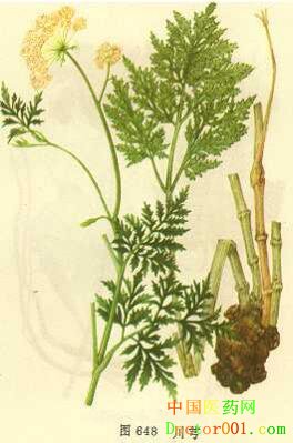 【標題】 川芎 【拼音】 Chuanxiong 【概述】 為傘形科植物川芎Ligusticum chuanxiong Hort.的根莖。主產于四川、貴州、云南,以四川產者質優。系人工栽培。5月采挖,除去泥沙,曬后烘干,再去須根。用時切片生用或酒炙。 【性味歸經】 辛,溫。歸肝、膽、心包經。 【功效】 活血行氣,祛風止痛。 【應用】 1.血瘀氣滯痛證。本品辛散溫通,既能活血化瘀,又能行氣止痛,為“血中之氣藥”,具通達氣血功效,故治氣滯血瘀之胸脅、腹部諸痛。若治心脈瘀阻之胸痹心痛,常與丹參、桂枝、檀香等同用;若治肝郁氣滯之脅痛,常配柴胡、白芍、香附,如柴胡疏肝散(《景岳全書》);如肝血瘀阻,積聚痞塊、胸脅刺痛,多與桃仁、紅花等同用,如血府逐瘀湯(《醫林改錯》)。若治跌仆損傷,瘀腫疼痛,可配乳香、沒藥、三七等藥用。 川芎善“下調經水,中開郁結”,為婦科要藥,能活血調經,可用治多種婦產科的疾病。如治血瘀經閉,痛經,常與赤芍、桃仁等同用,如血府逐瘀湯(《醫林改錯》);若屬寒凝血瘀者,可配桂心、當歸等,如溫經湯(《婦人大全良方》);若治產后惡露不下,瘀阻腹痛,可配當歸、桃仁、炮姜等,如生化湯(《傅青主女科》);若治月經不調,經期超前或錯后,可配益母草、當歸等,如益母勝金丹(《醫學心悟》)。 2.頭痛,風濕痹痛。本品辛溫升散,能“上行頭目”,祛風止痛,為治頭痛要藥,無論風寒、風熱、風濕、血虛、血瘀頭痛均可隨證配伍用之,故李東垣言“頭痛須用川芎”。治風寒頭痛,配羌活、細辛、白芷,如川芎茶調散(《和劑局方》);若配菊花、石膏、僵蠶,可治風熱頭痛,如川芎散(《衛生保健》);若治風濕頭痛,可配羌活、獨活、防風,如羌活勝濕湯(《內外傷辨惑論》);配當歸、白芍,取本品祛風止痛之功,可治血虛頭痛,如加味四物湯(《金匱翼》);若治血瘀頭痛,可配赤芍、麝香,如通竅活血湯(《醫林改錯》)。 本品辛散溫通,能祛風通絡止痛,又可治風濕痹痛,常配獨活、秦艽、防風、桂枝等藥同用,如獨活寄生湯(《千金方》)。 【注意】 陰虛火旺,多汗,熱盛及無瘀之出血證和孕婦慎用。 【用法用量】 煎服,3~9g。 【臨床研究】 1.化學成分:本品含生物堿(如川芎嗪),揮發油(主要為藁本內脂、香燴烯等),酚類物質(如阿魏酸),內脂素以及維生素A,葉酸,蔗糖,甾醇,脂肪油等。 2.藥理作用:川芎嗪能擴張冠狀動脈,增加冠狀動脈血流量,改善心肌的血氧供應,并降低心肌的耗氧量;川芎嗪可擴張腦血管,降低血管阻力,顯著增加腦及肢體血流量,改善微循環;能降低血小板表面活性,抑制血小板凝集,預防血栓的形成,;所含阿魏酸的中性成分小劑量促進,大劑量抑制子宮平滑肌;水煎劑對動物中樞神經系統有鎮靜作用,并有明顯而持久的降壓作用;可加速骨折局部血腫的吸收,促進骨痂形成;有抗維生素E缺乏作用;能抑制多種桿菌;有抗組織胺和利膽作用。 3.臨床研究: 川芎在臨床上應用廣泛。如:用川芎、紅花各等份壓片,每天口服3次,每次4片(每片含川芎、紅花各1.25 克),治療冠心病心絞痛84例,83例有效。(北京地區冠心病協作組。資料匯編(第二輯),1972,12)。每日用川芎嗪80—100毫升加入5%葡萄糖液500毫升靜滴1次,10次為1療程,治療缺血性中風急性期66例,恢復期154例,后遺癥期47例。結果:急性期有效率100%,恢復期有效率95.4%,后遺癥期有效率70.2%。(陜西中醫,1988.(9):408)。用川芎24—28克,白酒30毫升,水250毫升,浸泡1小時后,加蓋用文火燉煎分2次服,不飲酒者可單加水燉服,治療功能性子宮出血29例,均有效(陜西中醫,1990,11(4):150)。 【參考文獻】 1.《神農本草經》:“主中風入腦頭痛、寒痹,筋脈緩急,金瘡,婦人血閉無子。” 2.《本草匯言》:“芎艸穹,上行頭目,下調經水,中開郁結,血中氣藥。嘗為當歸所使,非第治血有功,而治氣亦神驗也……味辛性陽,氣善走竄而無陰凝粘滯之態,雖入血分,又能去一切風,調一切氣。” 3.《本草新編》:“川芎……血閉者能通,外感者能散,療頭風其神,止金瘡疼痛。此藥可君可臣,又可為佐使,但不可單用……倘單用一味以補血,則血動,反有散失之憂。若單用一味以止痛,則痛止,轉有暴亡之慮。” 【圖片】 川芎 ![]() 川芎《中藥學》 ![]() 川芎《本草綱目》 ![]() 川芎植株 ![]() 川芎藥材及飲片 ![]() 藥材川芎 ![]() 藥材川芎橫切面 ![]() 藥材川芎片 ![]() 【表格】 川芎《中藥歌決》 【歌決】 川芎辛溫包肝膽,破瘀通經解痙攣; 頭痛腦脹血壓高,腹痛筋攣臟燥煩。 (責任編輯:Doctor001) |