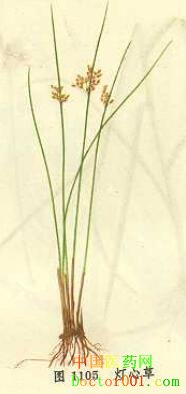 【標題】 燈心草 【拼音】 Dengxincao 【概述】 為燈心草科植物燈心草Juncus effusus L.的干燥莖髓。主產于江蘇、四川、云南、貴州等地。野生或栽培。夏末至秋季割取莖。曬干,取出莖髓,剪段,曬干,生用或制用。 【性味歸經】 甘、淡,微寒。歸心、肺、小腸經。 【功效】 利尿通淋,清心降火。 【應用】 1.淋證。本品甘淡能滲濕,性寒能清熱。故可清熱利尿,適用于小便不利,淋瀝澀痛之證。因其質輕力薄,臨證多與木通、瞿麥、車前子等同用,如八正散《和劑局方》。 2.心煩失眠,口舌生瘡。本品性寒,既能入心清心火,又可利尿泄熱以引導心火下降。用于心煩失眠,如《集驗方》單味煎服,也可與木通、竹葉、梔子等同用;用于小兒心熱夜啼,可與淡竹葉配伍,開水泡服,也可配車前草,煎湯服;治口舌生瘡,咽喉腫痛,將燈心炭研為末,涂抹患處或拈鹽吹喉。 【用法用量】 煎服,1~3g。外用適量。 【臨床研究】 1.化學成分:燈心草含纖維、脂肪油、蛋白質。此外,含有多聚糖。 2.藥理作用:本品有利尿、止血作用。 3.臨床研究: 據報道,以燈心草的一端 蘸芝麻油,點燃后迅速灸同側常規消毒耳尖發際處的角孫穴,至出現“啪”的聲音為止。治療小兒流行性腮腺炎,療效顯著(山西中醫,1999,1:54)。燈心草,仙鶴草,鐵莧菜,蔗糖。水煎服,治鼻衄,有顯效(湖北醫學院學報,1982,3:36)。燈心草還可治療慢性腎小球腎炎,胃腸型感冒。 【參考文獻】 1.《開寶本草》:“主五淋。” 2.《本草衍義補遺》:“治急喉痹,止夜啼。” 【圖片】 燈心草 ![]() 燈心草《本草圖苑》 ![]() 燈心草《本草綱目》 ![]() 藥材燈心草 ![]() (責任編輯:Doctor001) |