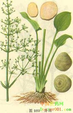 【標題】 澤瀉 【拼音】 Zexie 【概述】 為澤瀉科植物澤瀉Alisma orientalis ( Sam. ) Juzep.的干燥塊莖。主產福建、四川、江西等地。冬季莖葉開始枯萎時采挖,洗凈,干燥,除去須根及粗皮,以水潤透切片,曬干。麩炒或鹽水炒用。 【性味歸經】 甘,寒。歸腎、膀胱經。 【功效】 利水消腫,滲濕,泄熱。 【應用】 1.水腫,小便不利,泄瀉。本品淡滲,其利水作用較強,治療水濕停蓄之水腫,小便不利,常和茯苓、豬苓、桂枝配用,如五苓散(《傷寒論》);澤瀉能利小便而實大便,治脾胃傷冷,水谷不分,泄瀉不止,與厚樸、蒼術、陳皮配用,如胃苓湯(《丹溪心法》);本品瀉水濕,行痰飲,常治痰飲停聚,清陽不升之頭目昏眩,配白術同用,如澤瀉湯(《金匱要略》)。 2.淋證,遺精。本品性寒,既能清膀胱之熱,又能泄腎經之虛火,下焦濕熱者尤為適宜。故用治濕熱淋證,常與木通、車前子等藥同用;對腎陰不足,相火偏亢之遺精、潮熱,則與熟地黃、山茱萸、牡丹皮同用,如六味地黃丸(《小兒藥證直訣》)。 【用法用量】 煎服,5~10g。 【臨床研究】 1.化學成分:本品主要含澤瀉萜醇A、B、C,揮發油生物堿、天門冬素、樹脂等。 2.藥理作用:有利尿作用,能增加尿量,增加尿素與氯化物的排泄,對腎炎患者利尿作用更為明顯。有降壓、降血糖作用,還有抗脂肪肝作用。對金黃色葡萄球菌、肺炎雙球菌、結核桿菌有抑制作用。 3.臨床研究: 據報道,澤瀉、蒼術水煎,加蜂蜜調制成膏,口服,治療復發性丹毒,有效(浙江中醫雜志,1999,7:293)。口服澤瀉片 (每片相當于生藥2.5~2.8g)。治療高脂血癥,有明顯好轉(中草藥通訊1976,7:31)。澤瀉、白術,水煎服,治療內耳眩暈病,有效(陜西中醫,1989,12:534)。 【參考文獻】 1.《藥性論》:“主腎虛精自出,治五淋,利膀胱熱,宣通水。” 2.《本草要略》:“除濕通淋,止渴,治水腫,止瀉痢,以豬苓佐之。” 3.《本草綱目》:“滲濕熱,行痰飲,止嘔吐、瀉痢、疝痛、腳氣。” 【圖片】 澤瀉 ![]() 澤瀉《常用中藥》 ![]() 澤瀉《本草綱目》 ![]() 澤瀉全株 ![]() 藥材澤瀉 ![]() 【表格】 澤瀉《中藥歌決》 【歌決】 澤瀉味甘屬寒性,歸胃膀胱脾腎經; 清熱利尿益精氣,滲濕止瀉消水腫; 腎炎水腫糖尿病,腹脹吐瀉淋瀝痛。 (責任編輯:Doctor001) |
