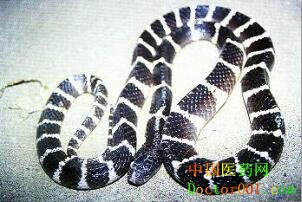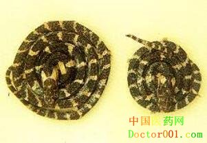 【標題】 白花蛇 【拼音】 Bái Huā Shé 【性味】 甘咸,溫,有毒。 ①《開寶本草》:"味甘咸,溫,有毒。" ②《本草圖經》:"有大毒。" 【歸經】 入肝、脾經。 ①《雷公炮制藥性解》:"入肺、肝二經。" ②《本草再新》:"入脾經。" 【功效】 祛風濕,透筋骨,定驚搐。治風濕癱瘓,骨節疼痛,麻風,疥癩,小兒驚風搐搦,破傷風,楊梅瘡,瘰疬惡瘡。 ①《雷公炮炙論》:"治風。" ②《藥性論》:"主治肺風鼻塞,身生白癜風、疬瘍、斑點及浮風癮疹。" ③《開寶本草》:"主中風濕痹不仁,筋脈拘急,口面歪斜,半身不遂,骨節疼痛,大風疥癩及暴風瘙癢,腳弱不能久立。" ④《綱目》:"通治諸風,破傷風,小兒風熱,急慢驚風,搐搦,瘰疬漏疾,楊梅瘡,痘瘡倒陷。" ⑤《本草匯》:"治癩麻風,白癜風,髭眉脫落、鼻柱塌壞者;鶴膝風,雞距風,筋爪拘攣,肌肉消蝕者。" ⑥《玉楸藥解》:"通關透節,泄濕驅風。" 【藥用】 為蝮蛇科動物五步蛇或眼鏡蛇科動物銀環蛇幼蛇等除去內臟的全體。 ①五步蛇 多于夏季捕捉,一般用長竹竿和鐵絲做成套索捕取。捕得后,剖腹除去內臟,盤成圓形,用竹片撐開后焙干,或不用竹片撐開,直接焙干。商品統稱為"大白花蛇"。撐開焙干者又稱為"蘄蛇鲞";直接焙干者稱為"蘄蛇棍"。 ②銀環蛇 于夏季捕捉幼蛇,剖腹除去內臟,盤成圓形,用竹簽撐開后焙干。商品稱為"金錢白花蛇"。 【注意】 陰虛內熱者忌用。 ①《本草經疏》:"中風口面歪斜、半身不遂,定緣陰虛血少內熱而發,與得之風濕者殊科,非所宜也。" ②《本草從新》:"唯真有風者宜之,若類中風屬虛者大忌。" ③《得配本草》:"虛弱者禁用。" ④《本草求真》:"忌鐵。" 【用法用量】 內服:煎湯,0.8~1.5錢;浸酒、熬膏或入丸、散。 【形態】 ①五步蛇又名:褰鼻蛇(《開寶本草》),蘄蛇(《綱目》),百步蛇、盤蛇、棋盤蛇、五步跳、龍蛇、尖吻蝮。 全長54~180厘米.頭大、扁平,呈三角形,如犁鏟狀。尾端側扁、尖銳。吻鱗和鼻間鱗向上突出;吻鱗之長為寬的2倍。前額鱗大,略呈五角形,額鱗較小;顱頂鱗比眼上鱗大。鼻孔大,開口于2鼻鱗之間。后鼻鱗向內凹入呈弧形。眼前鱗2片,眼后鱗1~2片,眼下鱗1片。前顳鱗2片,后顳鱗4~5片。上唇鱗7片,其中第3、4片最大;下唇鱗9~11片,前3片與前頦鱗相接。,體鱗有顯著起棱,成23~21~17行。腹鱗157~171片,肛鱗單一,尾下鱗40~60對,其前端的1~10片常不成對。體背面灰褐色,兩側有"∧"形大斑紋24個,斑紋暗褐色,邊緣濃褐色,其頂點常在背中線上相接,將背面隔成斜方塊形,頭頂暗黑色,頭側灰黃色,上唇下緣有灰褐色不規則小斑點,吻端尤多。眼前鱗至口角,有一大形黑褐色斑。腹面黃白色,兩側有直徑約2鱗左右的黑色圓斑。 棲于山地森林中,常盤居落葉下或巖洞內,行動緩慢。多以鳥類及小型哺乳動物為食。唾腺中具強烈的出血性及溶血性毒。分布浙江、福建、臺灣、湖南、湖北、江西、廣東、廣西等地。 本動物的頭部(白花蛇頭)、眼睛(白花蛇目睹)亦供藥用,各詳專條。 ②銀環蛇,又名:銀報應、寸白蛇、多條金甲帶、白節蛇、手巾蛇、斷肌甲。 全長30~160厘米。頭小,尾細長而尖。吻鱗寬大于高;鼻間鱗寬約為其長的1.5倍;前額鱗寬大于長,長為鼻間鱗長的2倍;顴鱗長稍大于寬;眼上鱗的長約和前額鱗長相等;顱頂鱗長約為額鱗與前額鱗之和。鼻孔橢圓形,開口于2鼻鱗之間。眼小,眼前鱗1片,眼后鱗2片,無頰鱗。前顳鱗1~2片,后顳鱗2片。上唇鱗7片,第3、4兩片入眼;下唇鱗7片,前4片與前頰鱗相接。體鱗光滑,15行;背中央的一行鱗片特別大,呈六角形。腹鱗198~218片。肛鱗單一,尾下鱗單行,40~53片。體背面黑色或藍黑色,有寬約1鱗左右的白色環帶斑紋37~61個。頭頂深紫褐色。腹面白色而略有灰褐色小斑點。尾部腹面紫褐色,白色環帶也很明顯。 棲于平原、山地、水邊等草叢中,亦常侵入人家屋內。多夜間活動,以魚,蛙、蛇、鼠等動物為食。唾腺中具強烈的神經性毒。 分布浙江、福建、臺灣、江西、湖南、湖北、廣東、廣西、貴州、云南等地。 【化學成分】 蛇毒中含有凝血酶樣物質、酯酶及3種抗凝血物質。凝血酶樣物質是一種糖蛋白(含13%糖),分子量約為33500。 銀環蛇蛇毒中的α環蛇毒素,是一種神經毒,已分離提純;分子量約8000;是74個氨基酸組成的一條多肽,有5個雙硫鍵。毒液中尚含膽堿酯酶、蛋白酶、ATP酶,5-核苷酸酶、磷酸二酯酶、磷脂酶A及透明質酸酶等酶,但與毒性沒有聯系。 【炮制】 大白花蛇:砍去頭尾,溫水潤軟,切成方塊,曬干;或用黃酒潤透后除去皮骨,曬干。(每白花蛇100斤,用黃酒50斤) 金錢白花蛇:刷去灰屑,除去頭尾即可;或用適量黃酒潤透后曬干。 ①《本草圖經》:"白花蛇,有大毒,頭尾各一尺尤甚,不可用,只用中斷干者。以酒浸去皮骨炙過收之,不復蛀壞。" ②《綱目》:"按《圣濟總錄》云,凡用花蛇,春、秋酒浸三宿,夏一宿,冬五宿,取出炭火焙干。如此三次,以砂瓶盛,埋地中一宿,出火氣,去皮骨,取肉用。" 【性狀】 ①大白花蛇 干燥體卷成圓盤形,頭在中央,盤徑18~25厘米,蛇體直徑約3厘米。頭呈三角形而扁平,鼻尖向上,口較寬大,俗稱"龍頭虎口",上顎有長毒牙。背部棕褐色,密被菱形鱗片,有縱向排列的24個方形灰白色花紋,習稱"方勝紋"。腹部白色,鱗片較大,雜有多數黑斑,習稱"念珠斑"。尾漸細,末端呈三角形,角質,習稱"佛指甲"。腹內部黃白色,脊椎骨突出顯著,兩側具多數肋骨。氣微腥,味微咸。以身干、