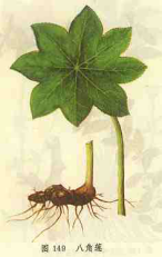 【標(biāo)題】 八角蓮 【拼音】 Bā Jiǎo Lián 【英文】 Common Dysosmatis Rhizome and Root,Sixangular Dysosma Rhizome and Root, Rhizome and root of Sixangular Dysosma,Rhizome and root of Veitch Dysosma 【拉丁文】 1.Dysosma versipellis(Hance)M.Cheng ex Ying2.Dysosma pleiantha (Hance)Woods.[D.hispida(Hao)Chun]3.Dysosma veitchii(Hemsl.et Wis.)Fu ex Ying 【異名】 鬼臼、爵犀、馬目毒公、九臼、天臼、解毒、害母草、獨(dú)腳蓮、獨(dú)荷草、羞天花、術(shù)律草、瓊田草、山荷葉、旱荷、八角盤、金星八角、獨(dú)葉一枝花、八角連、金魁連、八角烏、白八角蓮、金邊七 【性味】 味苦;辛;性涼;有毒 【歸經(jīng)】 肺;肝經(jīng) 【功效】 化談散結(jié);祛瘀止痛;清熱解毒。主咳嗽;咽喉腫痛;瘰疬;癭瘤;癰腫;疔瘡;毒蛇咬傷;跌打損作;痹證 【藥用】 為小檗科植物八角蓮、六角蓮和川八角蓮的根及根莖。 【注意】 孕婦禁服,體質(zhì)虛弱者慎服。 【用法用量】 內(nèi)服:煎湯,3-12g;磨汁,或入丸、散。外用:適量,磨汁或浸醋、酒涂搽;搗爛敷或研末調(diào)敷。 【形態(tài)】 1.八角蓮,多年生草本,莖直立,高20-30cm。不分枝,無毛,淡綠色。根莖粗壯,橫生,具明顯的碗狀節(jié)。莖生葉1片,有時2片,盾狀著生;葉柄長10-15cm;葉片圓形,直徑約30cm,常狀深裂幾達(dá)葉中部,邊緣4-9淺裂或深裂,裂片楔狀長圓形或卵狀橢圓形,長2.5-9cm,寬5-7cm,先端銳尖,邊緣具針刺狀鋸齒,上面無毛,下面密被或疏生柔毛。花5-8朵排成傘形花序,著生于近葉柄基處的上方近葉片處;花梗細(xì),長約5cm,花下垂,花冠深結(jié)色;萼片6,外面被疏毛;花瓣6,勺狀倒卵形,長約2.5cm;雄蕊6,蘊(yùn)含隔突出;子房上位,1室,柱頭大,盾狀。漿果橢圓形或卵形。種子多數(shù);ㄆ4-6月,果期8-10月。 2.六角蓮,多年生草本,莖直立,無毛,高10-20cm。根莖粗壯,節(jié)明顯。莖生葉通常2,對生,盾狀著生;葉柄長10-15cm,無毛;葉片長圓形或近圓形,長16-22cm,寬9-18cm,無毛6-9淺裂,裂片寬三角狀卵形,邊緣有針狀細(xì)齒。花5-10朵排成傘形花序,生于兩莖葉柄的交叉處,花梗長2-3(-6)cm,花下垂;萼片6,卵狀或橢圓狀長圓形,花瓣6,紫紅色,長圓形,長2.5-3.5cm,寬1-1.5cm;雄蕊6,長1.2-2.3cm,花藥長圓形,先端鈍;子房上位,1室,花柱短,柱頭盾狀。漿果近球形。花期5-6月,果期8-9月。 3.川八角蓮,多年生草本,莖多汁,高10-20cm;棵鼙蛔厣篦[片。葉互生,紙質(zhì),2片,盾狀著生;葉片圓形,直徑約20cm,通常6-8掌狀深裂幾達(dá)中部,裂片楔狀矩圓形,先端常3裂,小裂片三角形,上面無毛,葉中部紅棕色,下面葉脈有疏柔毛,后變無毛。傘形花序有2-6朵花,叢生于莖頂葉柄分叉處的腋間(稀有腋外生),花梗長1.5-2cm,有柔毛;萼片6,膜質(zhì),長圓狀披針形,長4-5cm,有時可達(dá)6cm;雄蕊6,花藥先端具細(xì)尖;子房1室,胚珠多數(shù),花柱短粗,柱頭大而呈流蘇狀。漿果卵形,紅色,長約3cm;ㄆ4-6月,果期8-10月。 【生態(tài)環(huán)境】 1.生于海拔300-2200m的山坡林下陰濕處。有少量栽培。 2.生于海拔600-1600m的山坡林下陰濕處,或有少量栽培。 3.生于海拔1200-2200m的山地陰濕林下。 【產(chǎn)地】 1.分布于浙江、江西、河南、湖北、湖南、廣東、廣西四川、貴州、云南等地。 2.分布于安徽、浙江、福建、臺灣、河南、湖北、湖南、廣西、四川、云南等省地。 3.分布于四川、貴州、云南。 【栽培】 生物學(xué)特性,喜陰涼潮濕,忌強(qiáng)光、干旱。適宜選擇富含腐殖質(zhì)、肥沃的砂質(zhì)壤土栽種。 栽培技術(shù),用種子繁殖或分株繁殖。種子繁殖:8-9月采集成熟果實(shí),搓去外皮,收集種子。穴作業(yè),覆草保溫。分株繁殖:2-3月挖取老根莖,截成12-15cm長小段,按行株距各30-35cm穴栽,每穴1段,覆土,澆水定根。4-11月均可移栽。 田間管理,可利用林下空地陰涼處栽培,如無良好自然蔭蔽條件,則需搭矮棚遮蔭。生長期注意澆水,保持土壤濕潤。春季多施氮肥,夏季多施腐熟有機(jī)肥。秋、冬季以廄肥、草原灰濕合培土越冬。 病蟲害防治,紅蜘啤酒用20%雙甲瞇乳油1000倍液噴殺。 【化學(xué)成分】 根和根莖含抗癌成分鬼臼毒素(Podophylloto-xin)和脫氧鬼臼毒素(Deoxypodophyllotoxin)。此外,尚分離出黃耆甙(AstragaIin)、金絲桃甙(Hyperin)、槲皮素(Quercetin)、山柰酚(Kaempferol)和谷甾醇。 1.八角蓮根莖及根含樹脂約4.2%,從中分得鬼臼毒素(鬼臼毒素,足葉草素,podophyl-lotoxin)、脫氧鬼臼毒素(deoxypodophyllotoxin)、4ˊ-去甲鬼臼毒素(4ˊ-demethylpodophyllotoxin、?-盾葉鬼臼素(?-peltatin)、?-盾葉鬼臼素(?-peltatin)、鬼臼毒酮(podophyl-lotoxone)、4ˊ-去甲異鬼臼苦酮(4ˊ-demethyl-isopicrop-odophyllone)、鬼臼苦酮(picropodophyllone)、去氫鬼臼毒素(dehydropodophyllotoxin)以及鬼臼毒素-4-O-葡萄糖甙。另含山柰酚等。 2.六角蓮根莖根含鬼臼毒素、4ˊ-去甲鬼臼毒酮、去氧鬼臼毒素、鬼臼毒酮、4ˊ-去甲鬼臼毒酮(4ˊ-demethylpodophyllotoxone)、異鬼臼苦酮(isopicropodophyllone)、鬼臼苦素(picropodophyllin)、鬼臼苦酮(picropodophyllone)、山荷葉素(di-phyllin)、去氫鬼臼毒素(dehy-dropodophyllotoxin)、尚含大黃素甲醚(physcion)、山柰酚、槲皮素、紫云英甙等。 【理化鑒別】 薄層層析:本品的乙醇提取液為供試液,另取鬼臼毒素乙醇液為對照品溶液,吸取供試液、對照品溶液,分別點(diǎn)于同一硅膠G薄層板上,以氯仿-甲醇(9:1)展開18cm,硫酸-乙醇(1 :1)噴霧,120℃烘烤5分鐘,顯深棕色斑點(diǎn)。 【藥理作用】 1.心肌作用:根中提出的結(jié)晶性物質(zhì),作用類