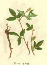 【標題】 千斤拔 【拼音】 Qiān Jīn Bá 【異名】 土黃雞、金雞落地(《植物名實圖考》),老鼠尾、透地龍、牛大力、千里馬、牛頓頭(《嶺南采藥錄》),吊馬樁,千斤吊、釘根藜、箭根、一條根、土黃耆(《江西中醫藥》(10):64,1957),大力黃(《廣西野生資源植物》),牛尾蕩(《南寧市藥物志》)。 【性味】 甘辛,溫。 ①《嶺南采藥錄》:"味辛,性溫。" ②《南寧市藥物志》:"甘,平,無毒。" ③《福建中草藥》:"甘微苦,平。" 【功效】 祛風利濕,消瘀解毒。治風濕痹痛,慢性腎炎,跌打損傷,癰腫,喉蛾。 ①《植物名實圖考》:"補氣血。" ②《嶺南采藥錄》:"祛風去濕。治手足痹痛,腰部風濕作痛,理跌打傷,能舒筋活絡。" ③《南寧市藥物志》:"壯筋骨,去瘀積。治跌打損傷,風濕骨痛,四肢酸軟無力,黃疸。" 【藥用】 為豆科植物蔓性千斤拔的根。秋后采挖,洗凈,切段,曬干。 【用法用量】 內服:煎湯,0.5~1兩。外用:磨汁涂或研末調敷。 【形態】 直立或披散亞灌木,高1~2米。根系向下直伸,長1米許。幼枝有棱角,披白柔毛。葉互生;3出復葉;托葉2片,三角狀,長約1厘米,具疏茸毛;葉柄長2~3厘米,被長茸毛;小葉矩圓形至卵狀披針形,長4~9厘米,寬2~4厘米,先端略鈍,有時具小銳尖,全緣,基部在葉背邊緣密被茸毛,上面被稀疏的短茸毛,下面密生長茸毛;小托葉2片,線形。花兩性,腋生,短總狀花序稠密;花梗長1~1.5厘米;花苞2裂;萼5裂,披針形,在最下面的1片最長;花冠略長于萼,粉紅色,旗瓣禿凈,圓形,基部白色,外有縱紫紋;翼瓣基部白色,有柄,前端紫色;龍骨瓣2片,基部淺白色,前部互相包著雌雄蕊;雄蕊10,兩體,花藥黃色,圓形;雌蕊1,子房上位。莢果長8~10毫米,徑約5毫米。種子2枚,圓形。花期8~9月。果期10月。 【產地】 生長于山坡草叢中。分布福建、臺灣、廣西、廣東、湖北、貴州、江西等地。產廣東、廣西、四川等地。 【性狀】 干燥根呈圓錐形,長15~30厘米,根頭部較膨大。外表棕紅色,有明顯皮孔。皮部易剝落。商品多切成長約3~7厘米的斜片狀。質堅硬,斷面白色,粉性,呈菊花心。 【附方】 ①治風濕筋骨痛及產后關節痛:千斤拔每次七錢至一兩,同豬蹄一只,以酒、水各半燉爛,去渣,食肉及湯。(《江西中醫藥》(10):64,1957) ②治慢性腎炎:千斤拔一至二兩,水煎服。(《新療法與中草藥選編》) ③治咳嗽:千斤拔鮮根一至二兩,水煎服。(《新療法與中草藥選編》) ④治跌打損傷:千斤拔七錢至一兩,酒、水各半煎服。(《江西中醫藥》(10):64,1957) ⑤治婦人白帶:千斤撥七錢至一兩,同豬精肉二、三兩,寬水同燉,去渣,食肉及湯。(《江西中醫藥》(10):64,1957) ⑥治黃腫:千斤拔一兩,酒磨服。 ⑦治喉蛾:千斤拔研細末,吹入喉內。 ⑧治腫毒:千斤拔,酒磨搽患處。(⑥方以下出《湖南藥物志》) ⑨治牙痛,牙癰:千斤拔一至二兩,蜂房三至五錢,水煎服。(《福建中草藥》) ⑩治蛇咬:千斤拔,水磨搽患處。(《湖南藥物志》) 【圖片】 千斤拔 ![]() (責任編輯:Doctor001) |