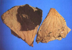 【標(biāo)題】 荷葉《中國藥典》 【名稱】 荷葉 【拼音】 Heye 【英文】 FOLIUM NELUMBINIS 【概述】 本品為睡蓮科植物蓮 Nelumbo nucifera Gaertn. 的干燥葉。夏、秋二季采收,曬至七、八成干時,除去葉柄,折成半圓形或折扇形,干燥。 【性味歸經(jīng)】 苦,平。歸肝、脾、胃經(jīng)。 【應(yīng)用】 清熱解暑,升發(fā)清陽,涼血止血。用于暑熱煩渴,暑濕泄瀉,脾虛泄瀉,血熱吐衄,便血崩漏。荷葉炭收澀化瘀止血。用于多種出血癥及產(chǎn)后血暈。 【貯藏】 置通風(fēng)干燥處,防蛀。 【用法用量】 3~9g ;鮮品15~30g ;荷葉炭3~6g 。 【理化鑒別】 本品粉末灰綠色。上表皮細(xì)胞多角形,外壁乳頭狀或短絨毛狀突起;氣孔不定式,副衛(wèi)細(xì)胞5~8個。下表皮細(xì)胞垂周壁略波狀彎曲,有時可見連珠狀增厚。草 酸鈣簇晶多見,直徑約至40μm 。 【炮制】 荷葉 噴水,稍潤,切絲,干燥。 荷葉炭 取凈荷葉,照煅炭法(附錄Ⅱ D)煅成炭。 【性狀】 本品呈半圓形或折扇形,展開后呈類圓形,全緣或稍呈波狀,直徑20~50cm。上表面深綠色或黃綠色,較粗糙;下表面淡灰棕色,較光滑,有粗脈21~22條, 自中心向四周射出;中心有突起的葉柄殘基。質(zhì)脆,易破碎。稍有清香氣,味微苦。 【圖片】 藥材荷葉 ![]() 蓮 ![]() 醫(yī)藥網(wǎng)【錄自】 《中國藥典》 (責(zé)任編輯:Doctor001) |