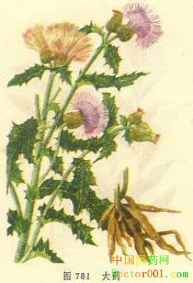 【標題】 大薊 【拼音】 Daji 【概述】 為菊科植物薊Cirsium japonicum DC.的地上部分或根。全國大部分地區(qū)均產(chǎn)。華北地區(qū)多用地上部分,華東地區(qū)多用地上部分及根,中南及西南地區(qū)多用根。夏、秋季花開時割取地上部分,或秋末挖根,除去雜質(zhì),曬干,生用或炒炭用。 【性味歸經(jīng)】 甘、苦,涼。歸心、肝經(jīng)。 【功效】 涼血止血,散瘀解毒消癰。 【應(yīng)用】 1.血熱出血證。本品寒涼而入血分,功能涼血止血,主治血熱妄行之諸出血證,尤多用于吐血、咯血及崩漏下血。如《不居集》治九竅出血,常與小薊相須為用;《本草匯言》治吐血、衄血、崩中下血,皆用鮮大薊根或葉搗汁服;若治外傷出血,可用本品研末外敷。 2.熱毒癰腫。本品既能涼血解毒,又能散瘀消腫,無論內(nèi)外癰腫都可運用,單味內(nèi)服或外敷均可,以鮮品為佳。如《日華子本草》以大薊葉生研調(diào)服治腸癰;《閩東本草》以鮮大薊煎湯內(nèi)服治肺癰;若外用治瘡癰腫毒,多與鹽共研,或鮮品搗爛外敷。 【用法用量】 煎服,10~15g,鮮品可用30~60g。外用適量,搗敷患處。 【臨床研究】 1.化學(xué)成分:本品主要含三萜和甾體類、揮發(fā)油類,長鏈炔醇類和黃酮苷類化合物。 2.藥理作用:大薊水煎劑能顯著縮短凝血時間,其水浸劑、乙醇-水浸出液和乙醇浸出液均有降低血壓作用,乙醇浸劑對人型結(jié)核桿菌有抑制作用,水提物對單純皰疹病毒有明顯的抑制作用。 3.臨床研究: 用大、小薊各30g,清水洗凈,放碗中搗爛,擠出液汁,慢火燉開加糖服下,治療上消化道出血,有效(中醫(yī)雜志,1965,12:16);用大薊100g,水煎分2次口服,每日1劑。若每劑加瘦肉30~60g,或豬肺30g同煎更好。連服3個月為1療程。共觀察肺結(jié)核26例,結(jié)果:痊愈4例,好轉(zhuǎn)17例,無效5例(浙江中醫(yī)雜志,1987,11:489);用鮮大薊根,洗凈切細,搗爛取汁與食用菜油按比例調(diào)成糊狀,涂抹患處。治療Ⅰ、Ⅱ燒燙傷患者182例,均在10~30天內(nèi)痊愈(中醫(yī)雜志,1988,3:13);另有以本品為主,內(nèi)服或外用治療高血壓病、乳腺炎以及肌內(nèi)注射所引起的硬結(jié)等。 【參考文獻】 1.《名醫(yī)別錄》:“主女子赤白沃,安胎,止吐血,鼻衄,令人肥健。” 2.《本草經(jīng)疏》:“大薊根,陶云有毒,誤也。女子赤白沃,血熱所致也,胎因熱則不安,血熱妄行,溢出上竅則吐衄。大薊根最能涼血,血熱解,則諸證自愈矣。” 3.《本草新編》:“大薊,破血止血甚奇,消腫安崩亦效,去毒亦神。但用于初起之血癥大獲奇功,而不能治久傷之血癥也。蓋性過于涼,非胃所善,可以降火,而不可以培土故耳。” 【圖片】 大薊 ![]() 大薊《本草綱目》 ![]() 大薊植株 ![]() 藥材大薊 ![]() 藥材大薊葉表面觀示上下表皮、氣孔及非腺毛 ![]() 藥材大薊根 ![]() 藥材大薊根橫切面 ![]() 薊 ![]() 薊《中藥學(xué)》 ![]() 【表格】 大薊《中藥歌決》 【歌決】 大薊甘涼歸肝脾,涼血止血化瘀積; 血熱吐衄腸癰腫,瘀血惡瘡乳汁閉。 (責任編輯:Doctor001) |